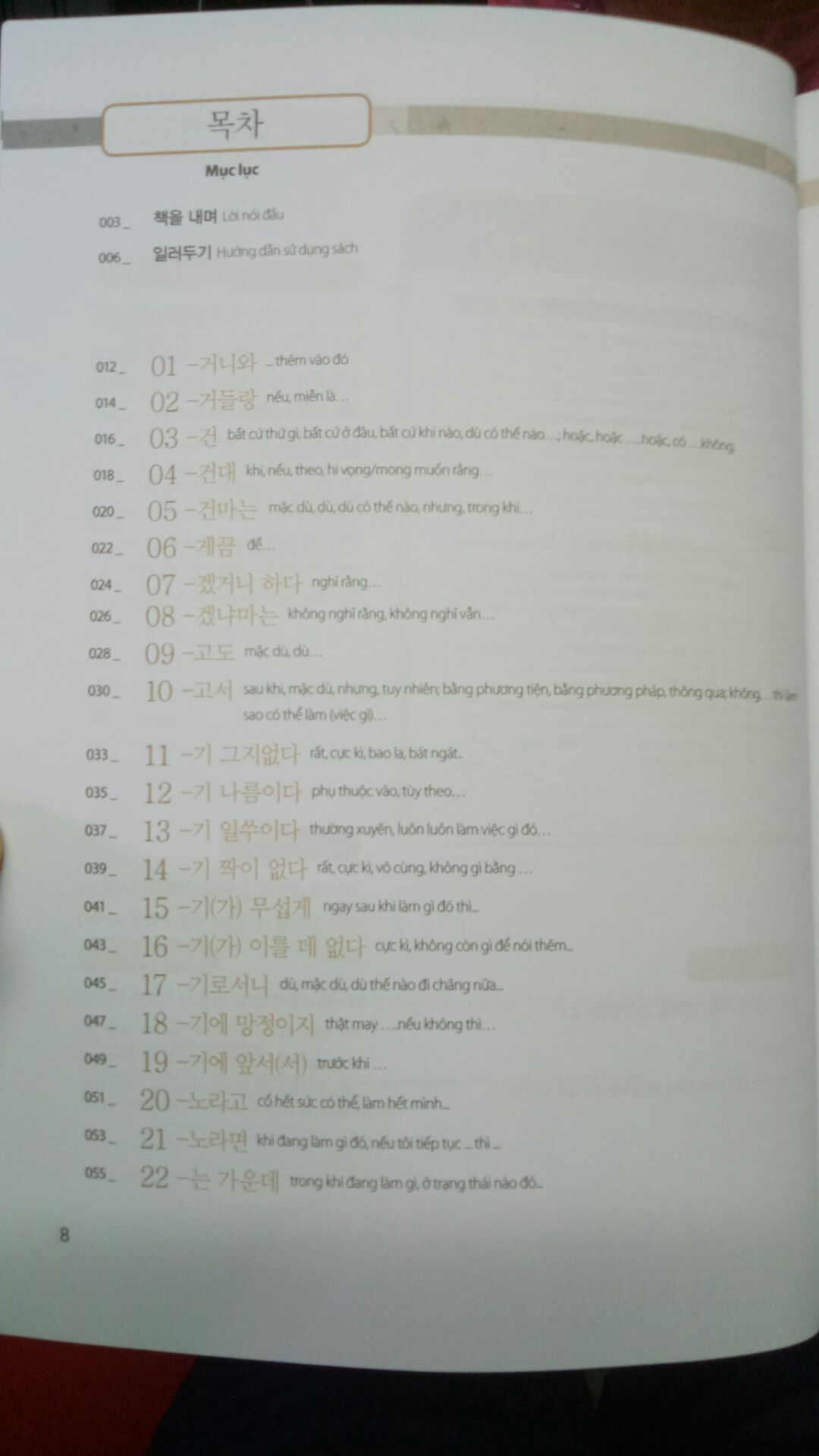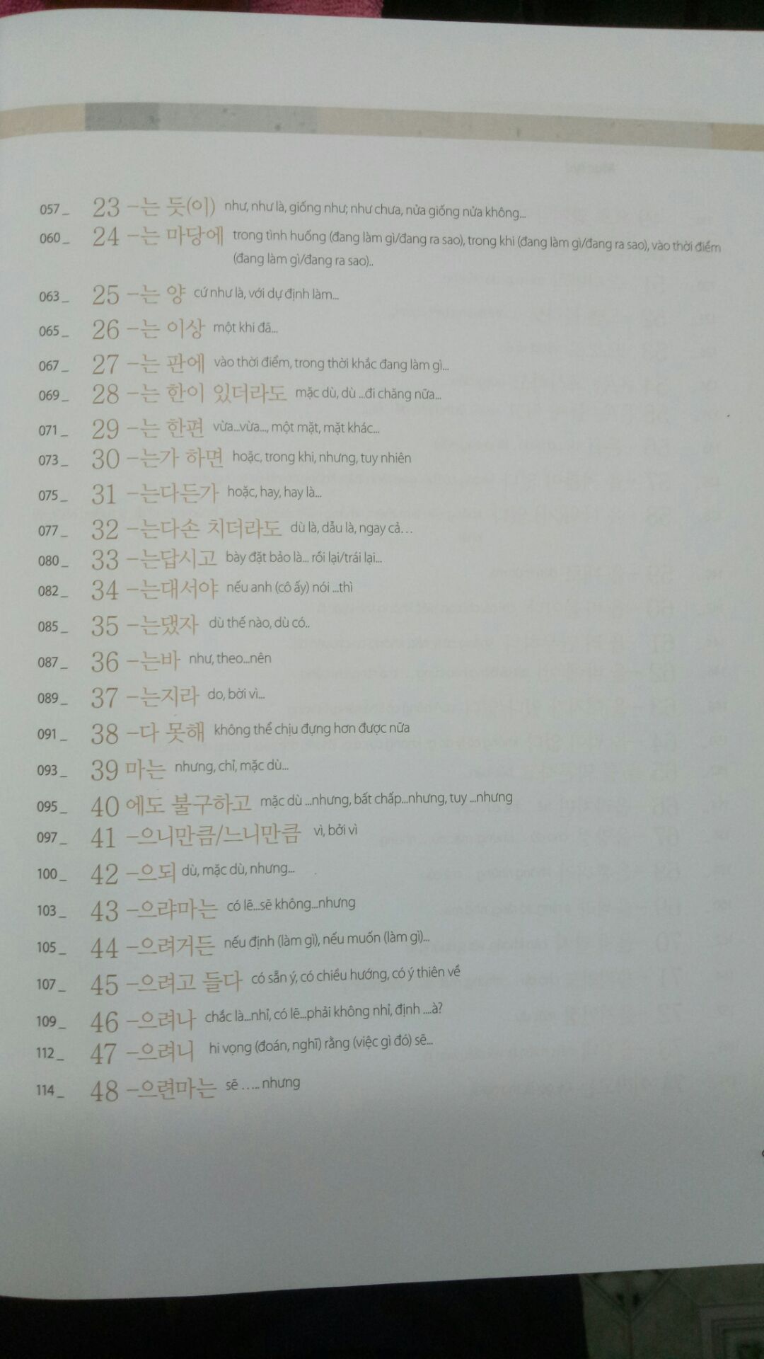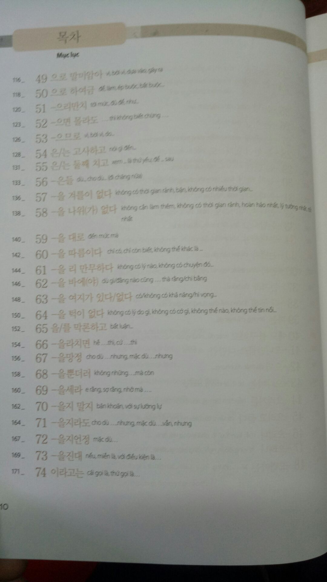 Mục lục ghi hẳn nghĩa cấu trúc bằng tiếng Việt nên dễ tìm kiếm. Cuốn này có 75 cấu trúc nhưng chỉ 125k, còn cuốn Ngữ pháp Tiếng Hàn Thông dụng cao cấp của Ahn Jean-myung+ Seon Eun-hee thì có 85 cấu trúc nhưng tận 285k (bù lại có hình minh họa đẹp). 2 cuốn thì có khoảng 28 cấu trúc giống nhau nhưng phần giải thích nghĩa sẽ khác nhau 1 tí.