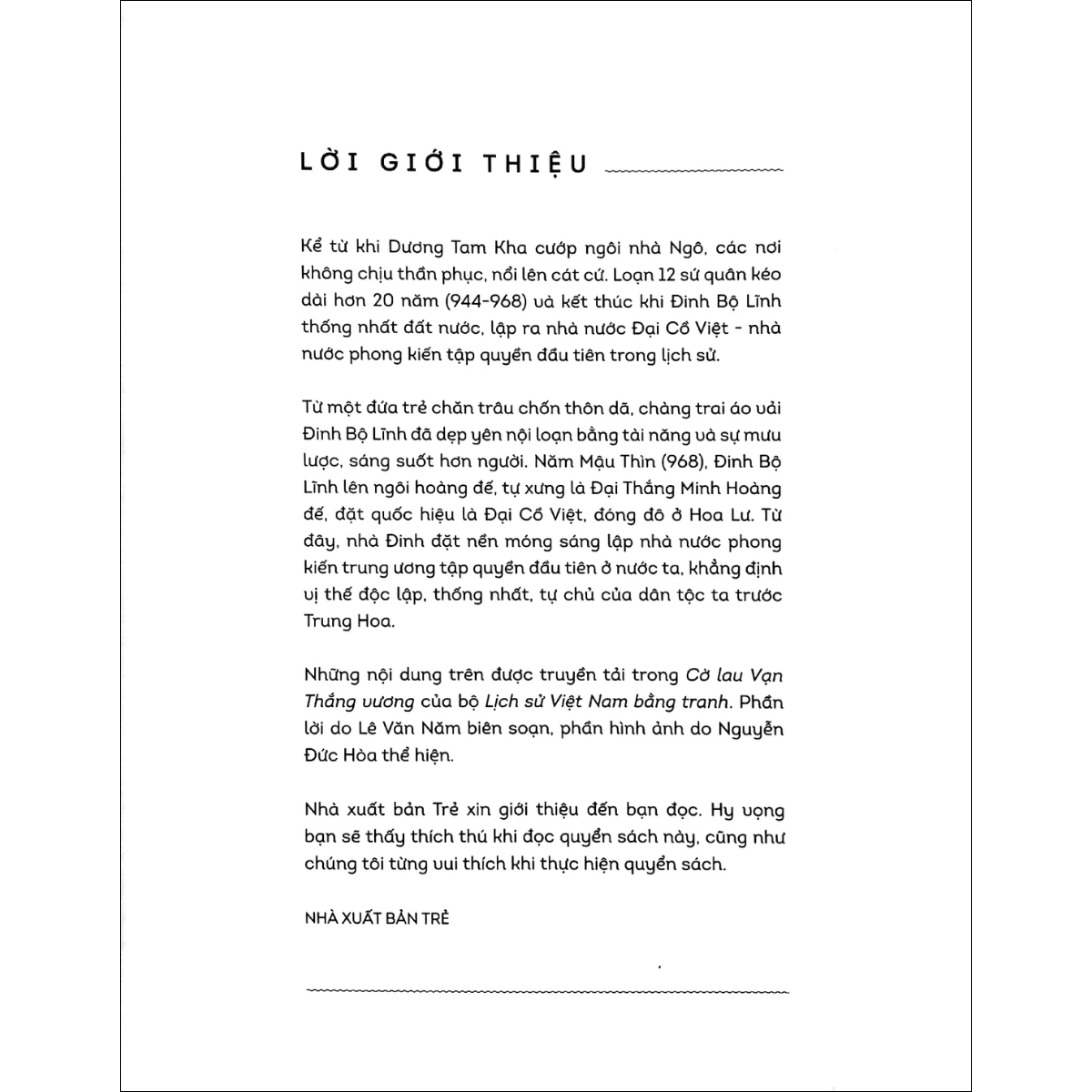 Từ một đứa trẻ chăn trâu nơi chốn thôn dã, chàng trai Đinh Bộ Lĩnh đã dẹp yên nội loạn bằng tài năng, mưu lược, sáng suốt hơn người. Năm Mậu Thìn (968), Đinh Bộ Lĩnh lên ngôi Hoàng đế, tự xưng là Đại Thắng Minh Hoàng đế, đặt quốc hiệu là Đại Cồ Việt, đóng đô ở Hoa Lư. Từ đây, nhà Đinh đặt nền móng sáng lập nhà nước phong kiến trung ương tập quyền đầu tiên ở nước ta, khẳng định vị thế độc lập, thống nhất, tự chủ của dân tộc ta trước Trung Hoa.Giá sản phẩm trên Tiki đã bao gồm thuế theo luật hiện hành. Bên cạnh đó, tuỳ vào loại sản phẩm, hình thức và địa chỉ giao hàng mà có thể phát sinh thêm chi phí khác như phí vận chuyển, phụ phí hàng cồng kềnh, thuế nhập khẩu (đối với đơn hàng giao từ nước ngoài có giá trị trên 1 triệu đồng).....