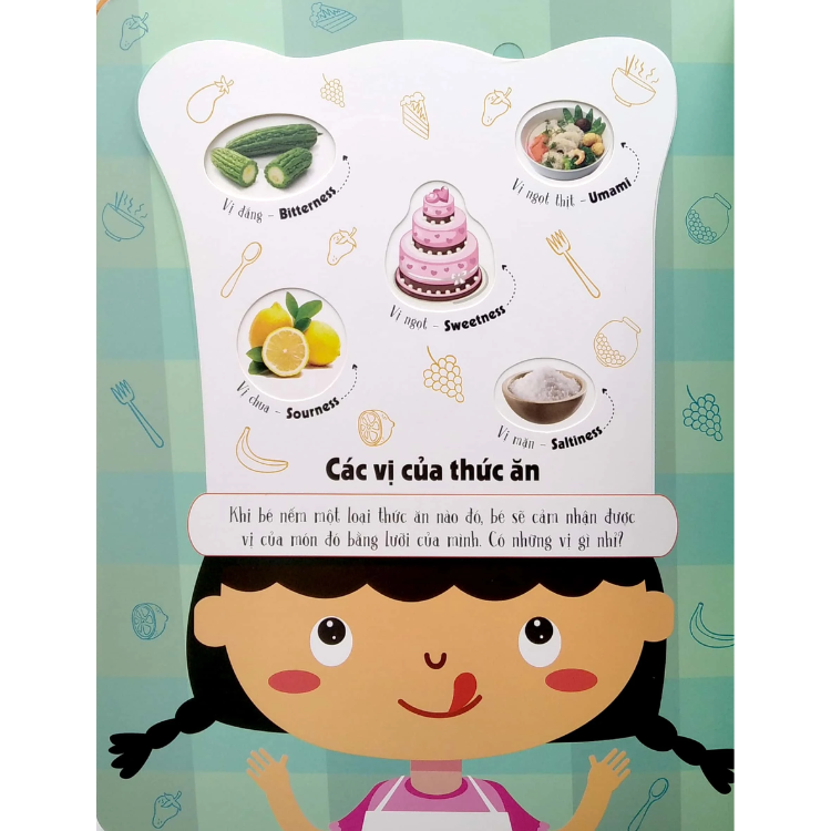 - Bố mẹ và bé hãy MỞ cuốn sách này ra rồi LẬT những miếng ghép lên để cùng HỌC rất nhiều từ song ngữ Việt - Anh về thức ăn nhé!