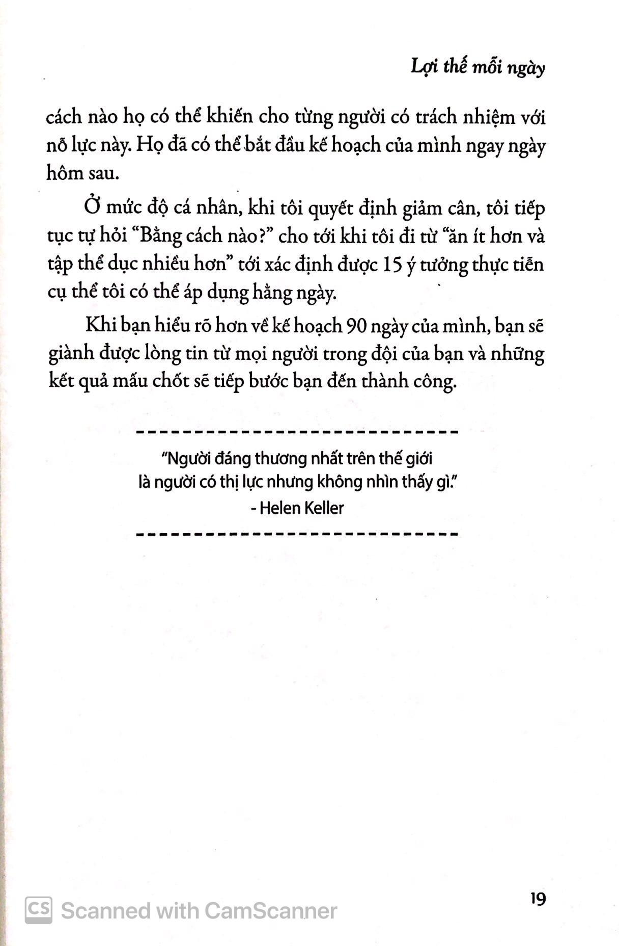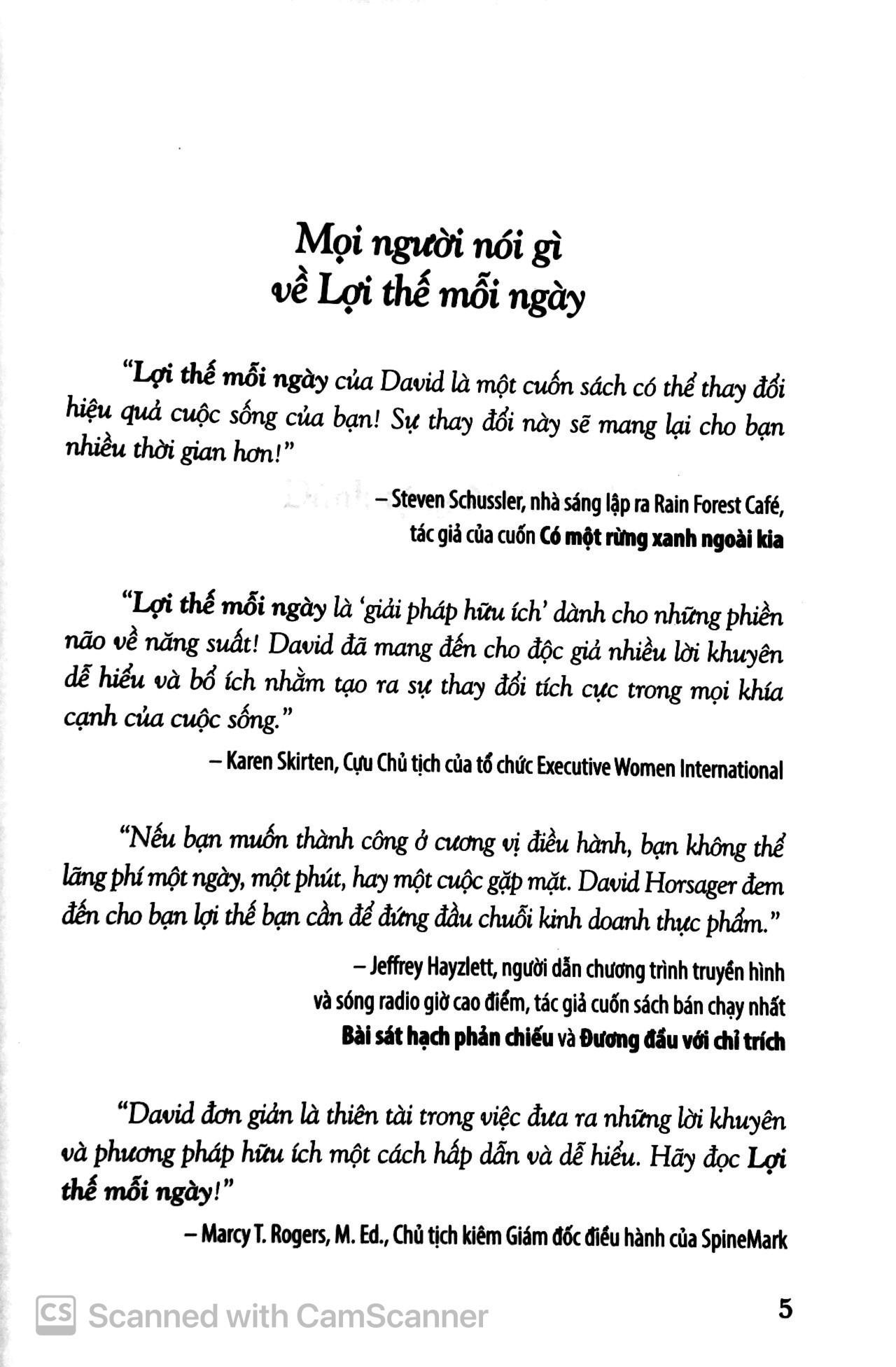Bạn sẽ tìm thấy câu trả lời cho những câu hỏi trên cùng nhiều mẹo đơn giản nhưng vô cùng hữu ích khác trong Lợi Thế Mỗi Ngày. David Horsager giới thiệu cho bạn 35 mẹo giúp tăng hiệu suất công việc một cách dễ hiểu và cô đọng trong từng chương. Khi áp dụng những mẹo này trong công việc hàng ngày của chính bạn, bẹn sẽ thấy mình làm việc năng suất hơn, sử dụng thời gian hiệu quả hơn, và khi đó bạn đã có được cho mình Lợi Thế Mỗi Ngày.
