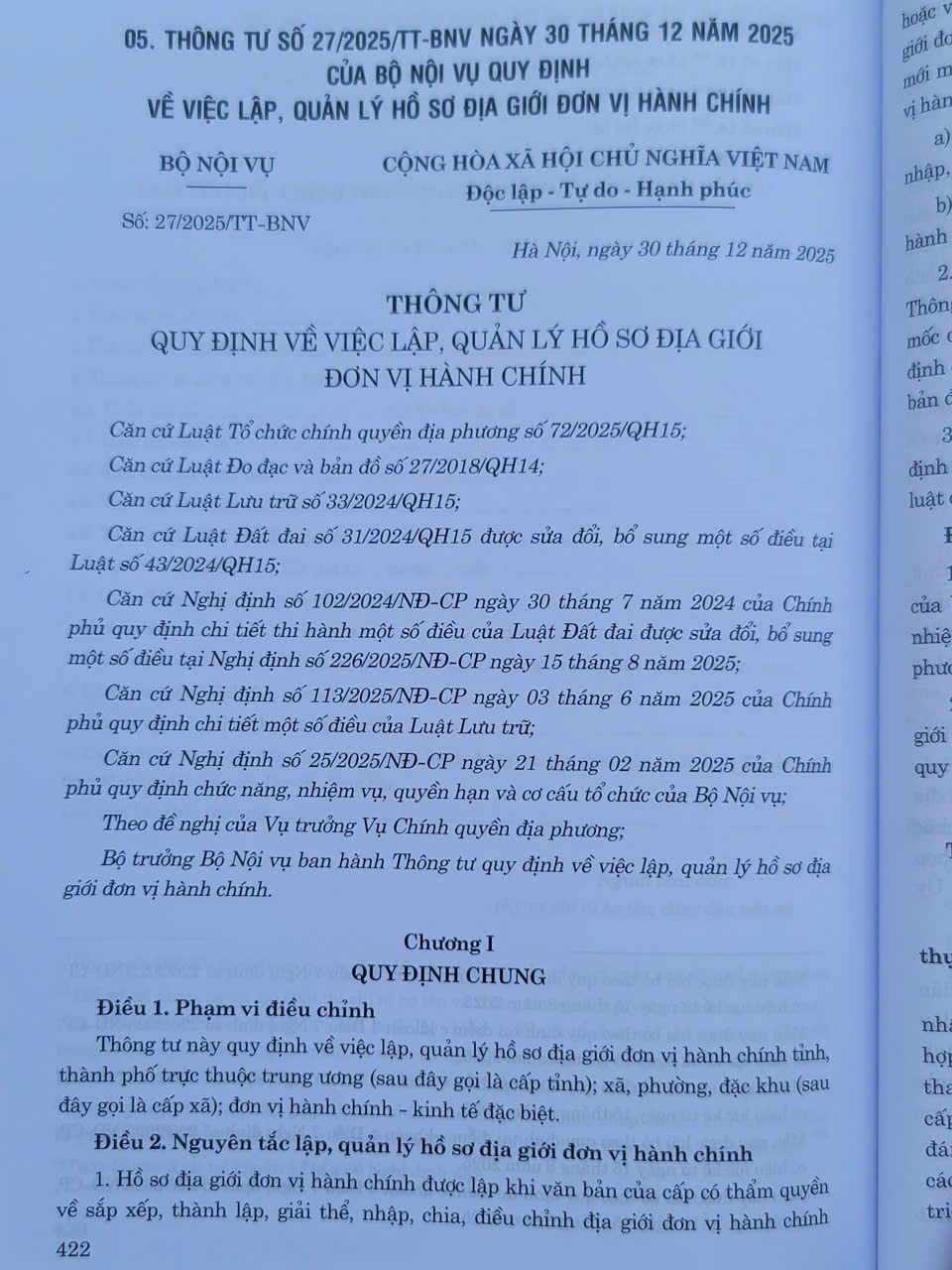 - THÔNG TƯ SỐ 27/2025/TT-BNV ngày 30 tháng 12 năm 2025 CỦA BỘ NỘI VỤ QUY ĐỊNH VỀ VIỆC LẬP, QUẢN LÝ HỒ SƠ ĐỊA GIỚI ĐƠN VỊ HÀNH CHÍNH