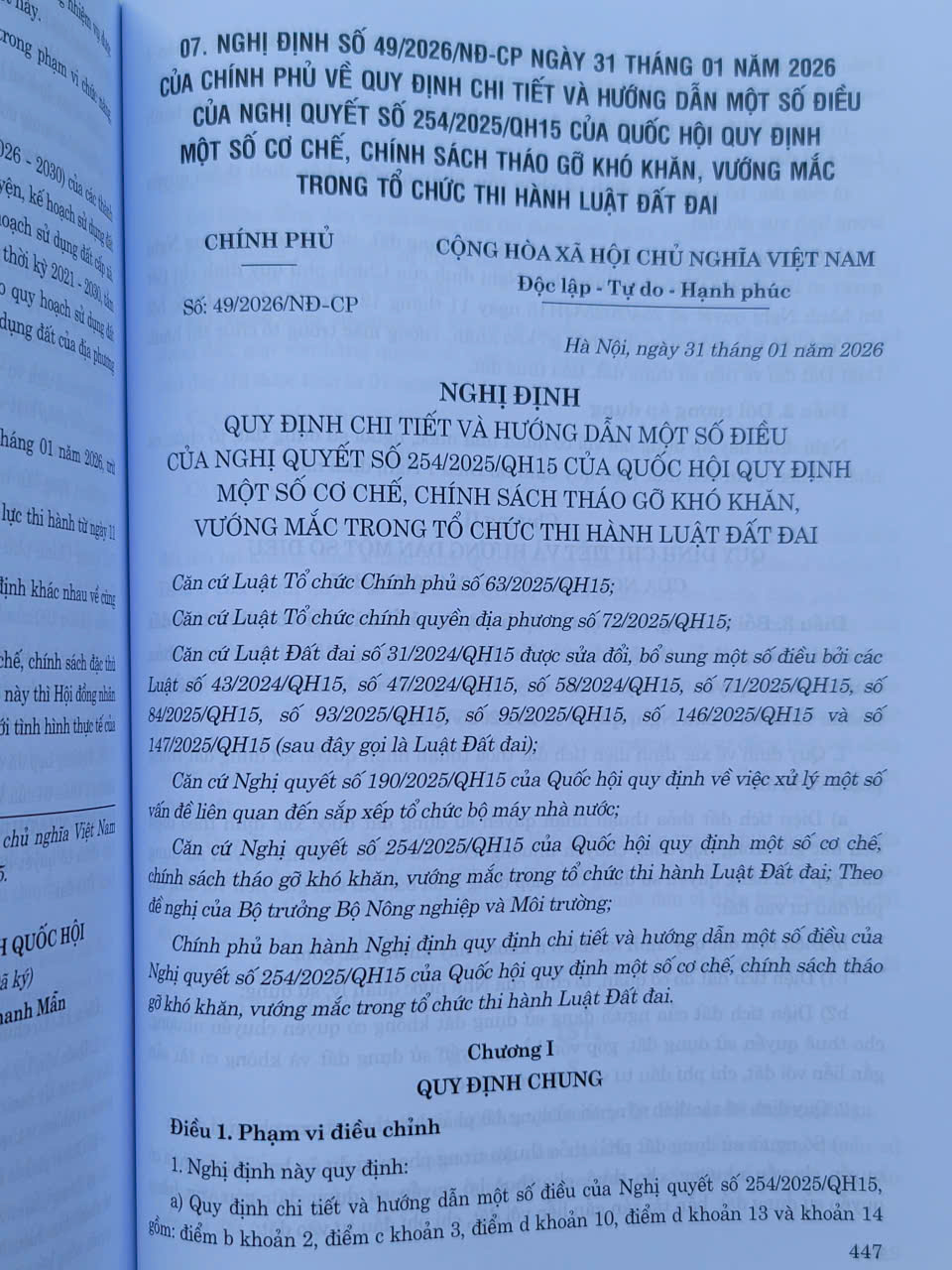 - NGHỊ ĐỊNH SỐ 49/2026/NĐ-CP ngày 31 tháng 01 năm 2026 CỦA CHÍNH PHỦ VỀ QUY ĐỊNH CHI TIẾT VÀ HƯỚNG DẪN MỘT SỐ ĐIỀU CỦA NGHỊ QUYẾT SỐ 254/2025/QH15 CỦA QUỐC HỘI QUY ĐỊNH MỘT SỐ CƠ CHẾ, CHÍNH SÁCH THÁO GỠ KHÓ KHĂN, VƯỚNG MẮC TRONG TỔ CHỨC THI HÀNH LUẬT ĐẤT ĐAI