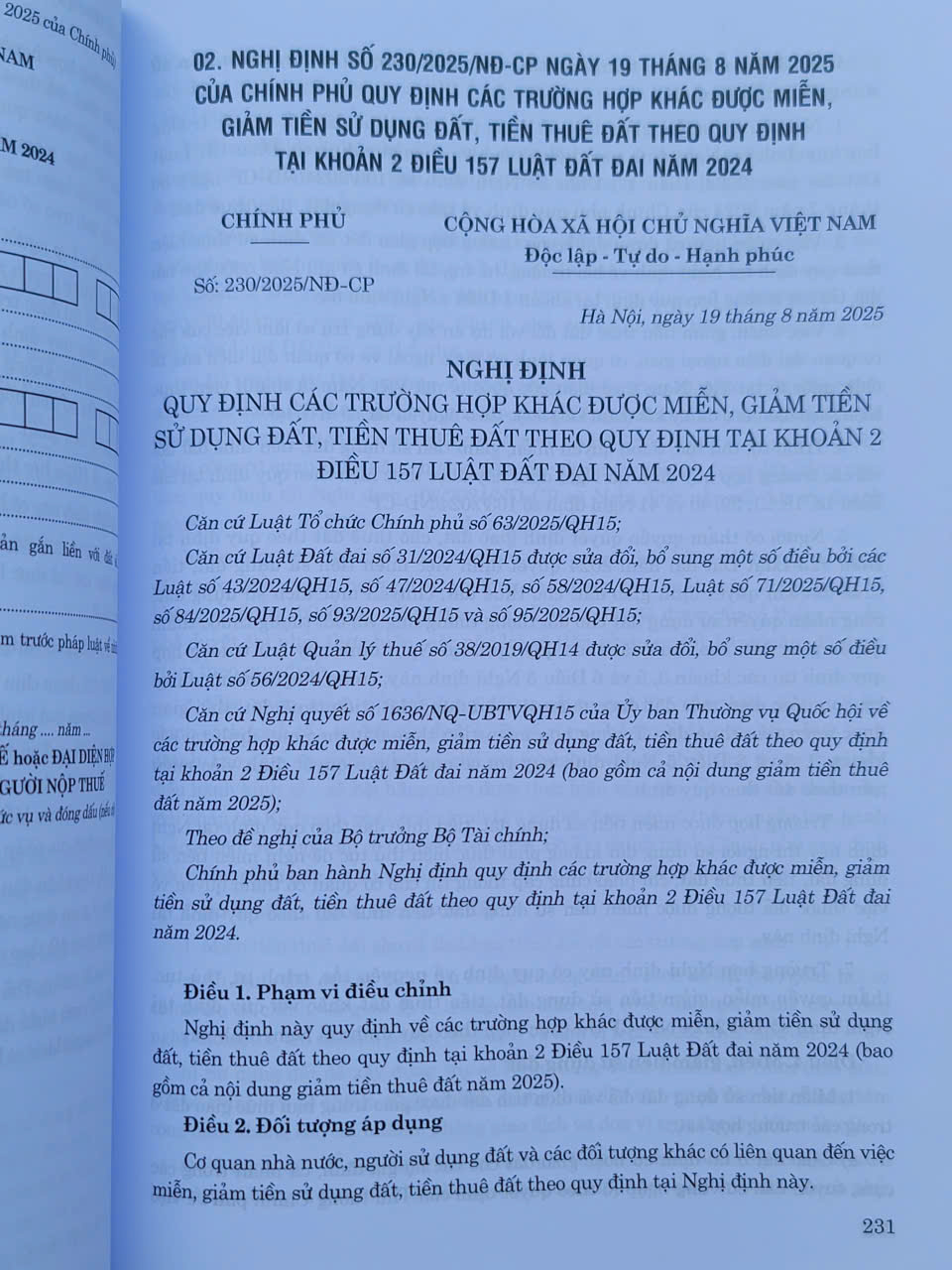 - NGHỊ ĐỊNH SỐ 230/2025/NĐ-CP ngày 18 tháng 8 năm 2025 CỦA CHÍNH PHỦ QUY ĐỊNH CÁC TRƯỜNG HỢP KHÁC ĐƯỢC MIỄN, GIẢM TIỀN SỬ DỤNG ĐẤT, TIỀN THUÊ ĐẤT THEO QUY ĐỊNH TẠI KHOẢN 2 ĐIỀU 157 LUẬT ĐẤT ĐAI NĂM 2024