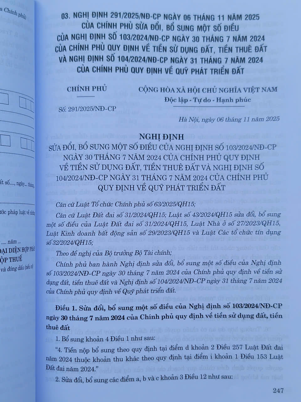 - NGHỊ ĐỊNH 291/2025/NĐ-CP ngày 06 tháng 11 năm 2025 CỦA CHÍNH PHỦ SỬA ĐỔI, BỔ SUNG MỘT SỐ ĐIỀU CỦA NGHỊ ĐỊNH SỐ 103/2024/NĐ-CP ngày 30 tháng 7 năm 2024 CỦA CHÍNH PHỦ QUY ĐỊNH VỀ TIỀN SỬ DỤNG ĐẤT, TIỀN THUÊ ĐẤT VÀ NGHỊ ĐỊNH SỐ 104/2024/NĐ-CP ngày 31 tháng 7 năm 2024 CỦA CHÍNH PHỦ QUY ĐỊNH VỀ QUỸ PHÁT TRIỂN ĐẤT