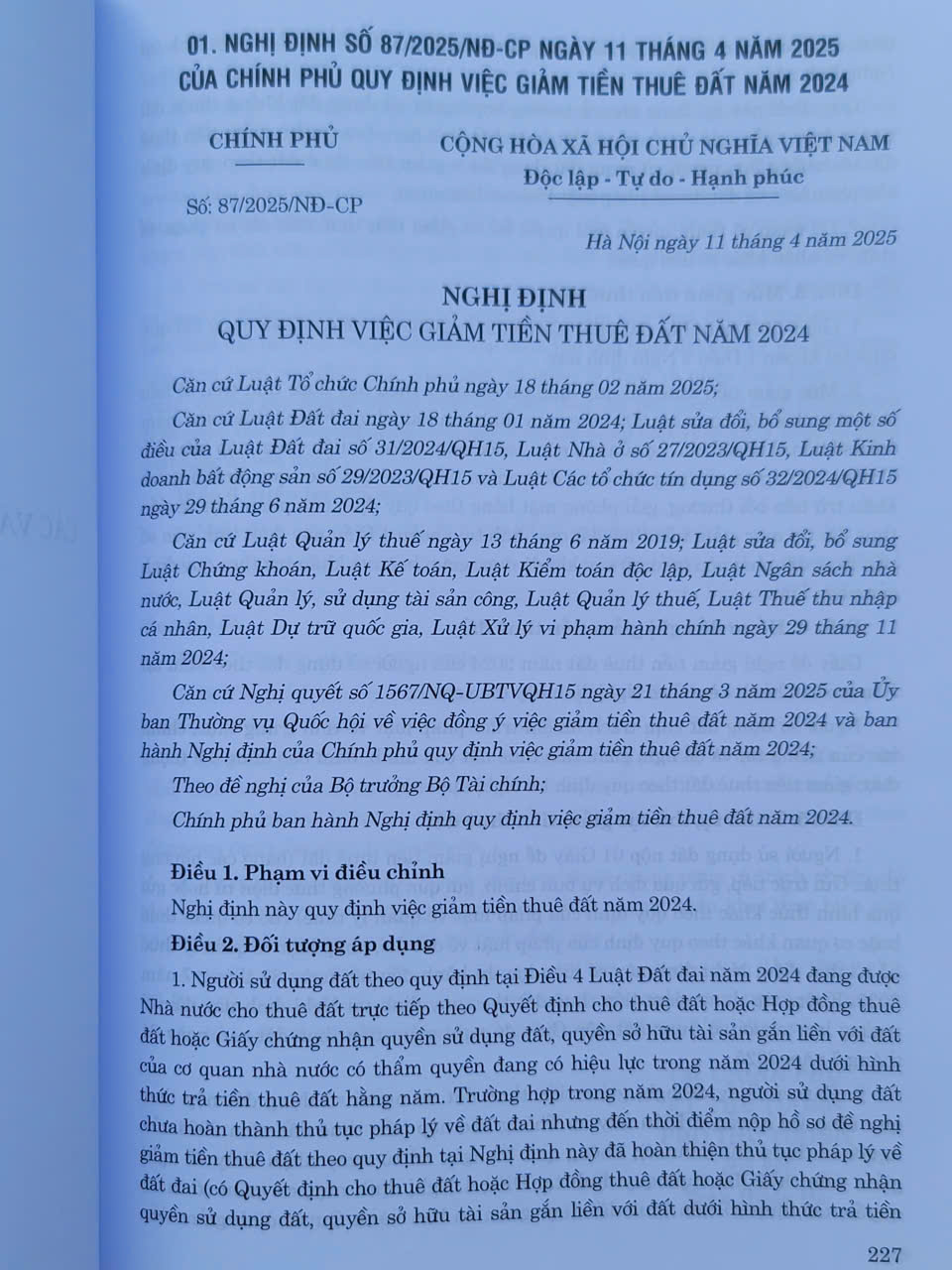 - NGHỊ ĐỊNH SỐ 87/2025/NĐ-CP ngày 11 tháng 4 năm 2025 CỦA CHÍNH PHỦ QUY ĐỊNH VIỆC GIẢM TIỀN THUÊ ĐẤT NĂM 2024