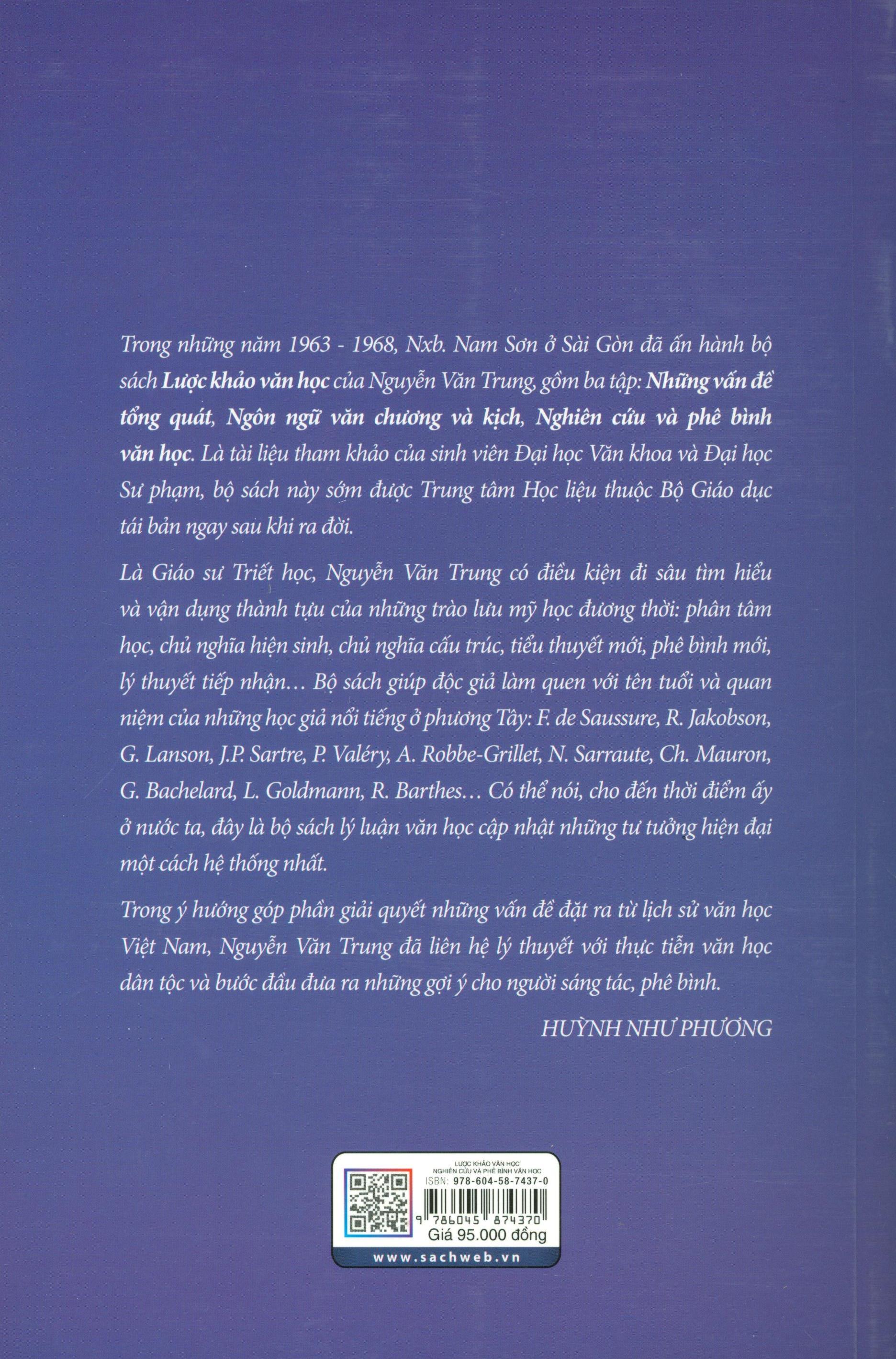 Trong những năm 1963-1968, NXB Nam Sơn ở Sài Gòn đã ấn hành bộ sách Lược khảo văn học của Nguyễn Văn Trung, gồm ba tập: Những vấn đề tổng quát, Ngôn ngữ văn chương và kịch, Nghiên cứu và phê bình văn học. Là tài liệu tham khảo của sinh viên Đại học Văn khoa và Đại học Sư phạm, bộ sách này sớm được Trung tâm Học liệu thuộc Bộ Giáo dục tái bản ngay sau khi ra đời.Là Giáo sư Triết học, Nguyễn Văn Trung có điều kiện đi sâu tìm hiểu và vận dụng thành tựu của những trào lưu mỹ học đương thời: phân tâm học, chủ nghĩa hiện sinh, chủ nghĩa cấu trúc, tiểu thuyết mới, phê bình mới, lý thuyết tiếp nhận. Bộ sách giúp độc giả làm quen với tên tuổi và quan niệm của những học giả nổi tiếng ở phương Tây: F. de Saussure, R. Jakobson, G. Lanson, J.P. Sartre. Có thể nói, cho đến thời điểm ấy ở nước ta, đây là bộ sách lý luận văn học cập nhật những tư tưởng hiện đại một cách hệ thống nhất.