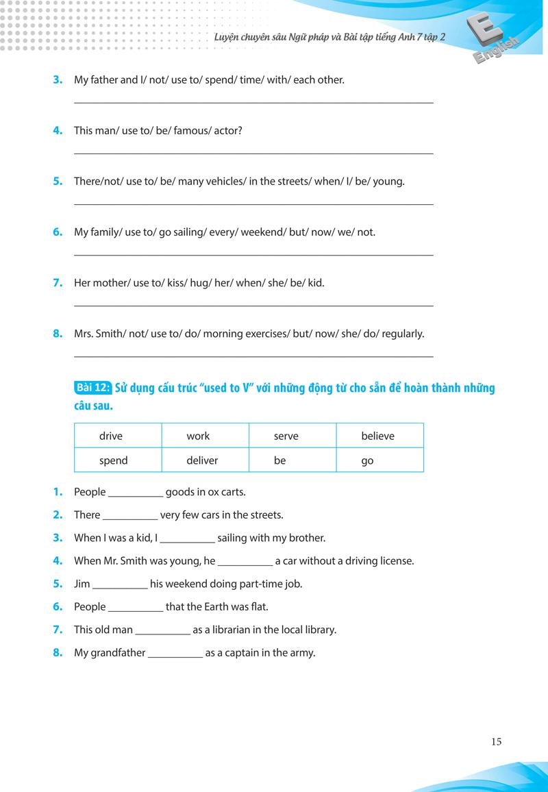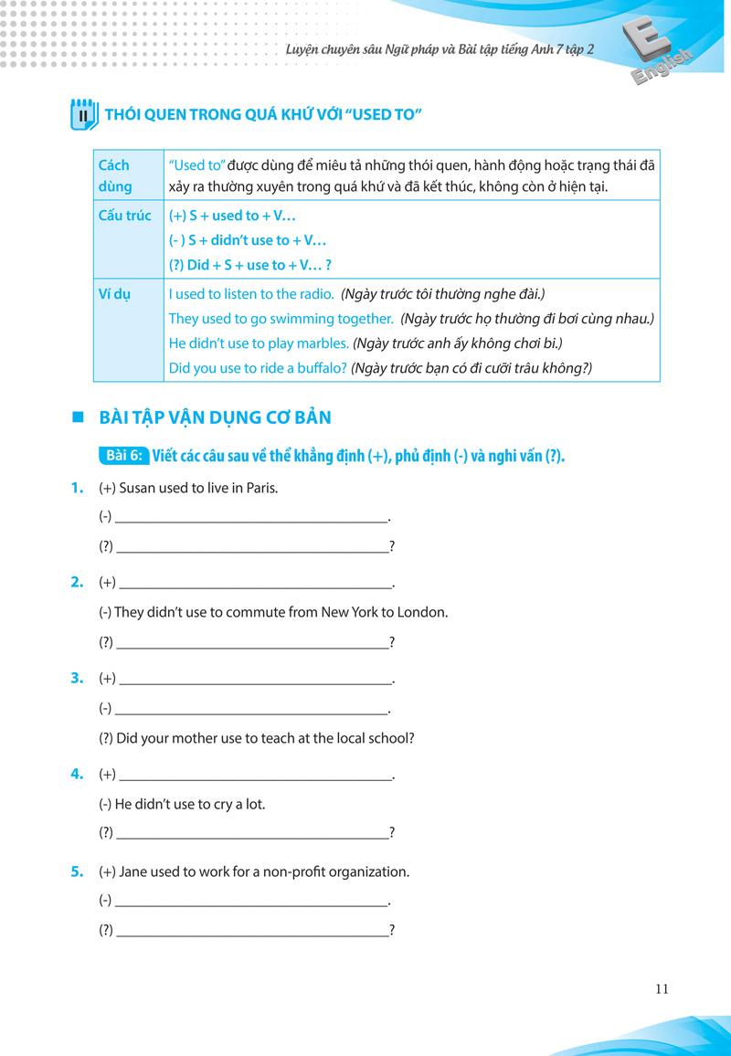 Luyện Chuyên Sâu Ngữ Pháp Và Bài Tập Tiếng Anh 7 Tập 2 (Chương Trình Mới) phù hợp với tất cả các đối tượng học sinh có học lực từ trung bình đến khá, giỏi. Cuốn sách sẽ luôn là người bạn đồng hành giúp em chinh phục bài kiểm tra, bài thi Tiếng Anh 7.