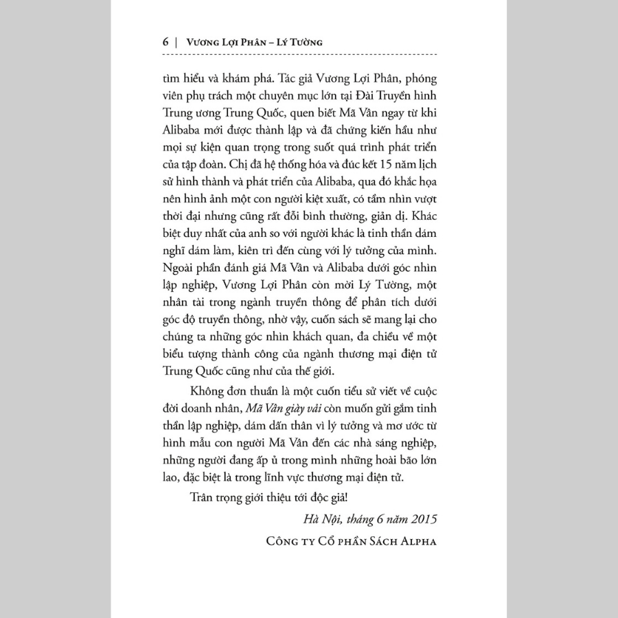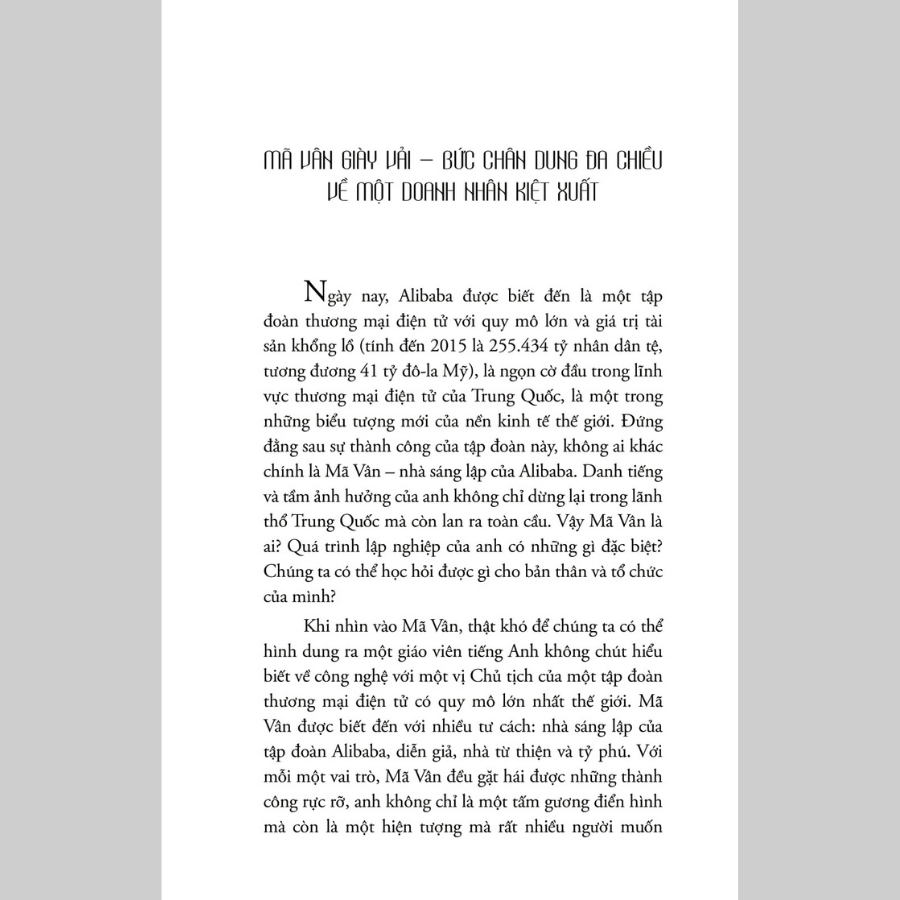 Ngày nay, ALIBABA là một tập đoàn thương mại điện tử toàn cầu với quy mô và giá trị tài sản khổng lồ (tính đến 2015 là 255.434 tỷ nhân dân tệ, tương đương 41 tỷ đô-la Mỹ), là ngọn cờ đầu trong lĩnh vực thương mại điện tử của Trung Quốc, một trong những biểu tượng mới của nền kinh tế thế giới. Đứng sau sự thành công của tập đoàn này không ai khác chính là Mã Vân - nhà sáng lập của Alibaba. Tuy nhiên, thật khó để chúng ta hình dung ra con đường nào để Mã Vân từ một giáo viên tiếng Anh không chút hiểu biết về công nghệ, trở thành vị Chủ tịch của một tập đoàn thương mại điện tử lớn nhất toàn cầu. Mã Vân được biết đến với nhiều tư cách: Nhà sáng lập, diễn giản, nhà từ thiện và tỷ phú. Với mỗi vai trò, Mã Vân đều gặp hái được những thành công rực rỡ, anh không chỉ là tấm gương điển hình mà hơn thế, anh còn là một hiện tượng rất nhiều người muốn tìm hiểu và khám phá.
