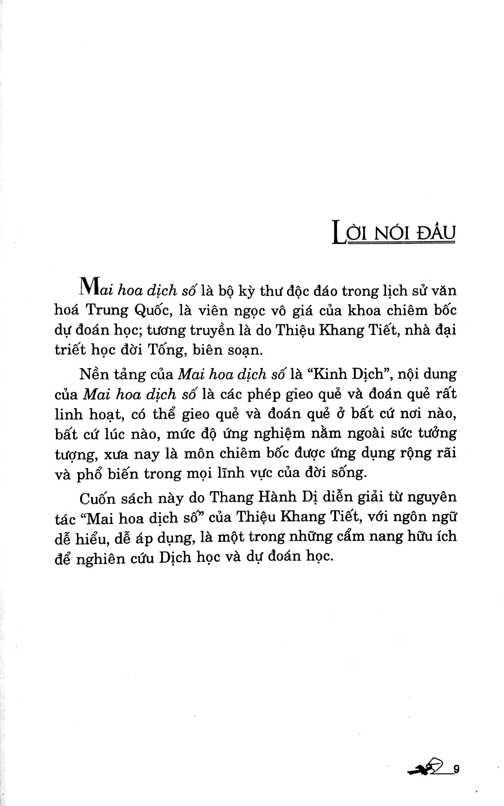 Mai hoa dịch số là bộ kỳ thư độc đáo trong lịch sử văn hóa Trung Hoa, là viên ngọc quý của khoa chiêm bốc dự đoán học, tương truyền do Thiệu Khang Tiết, nhà đại triết học đời Tống biên soạn.