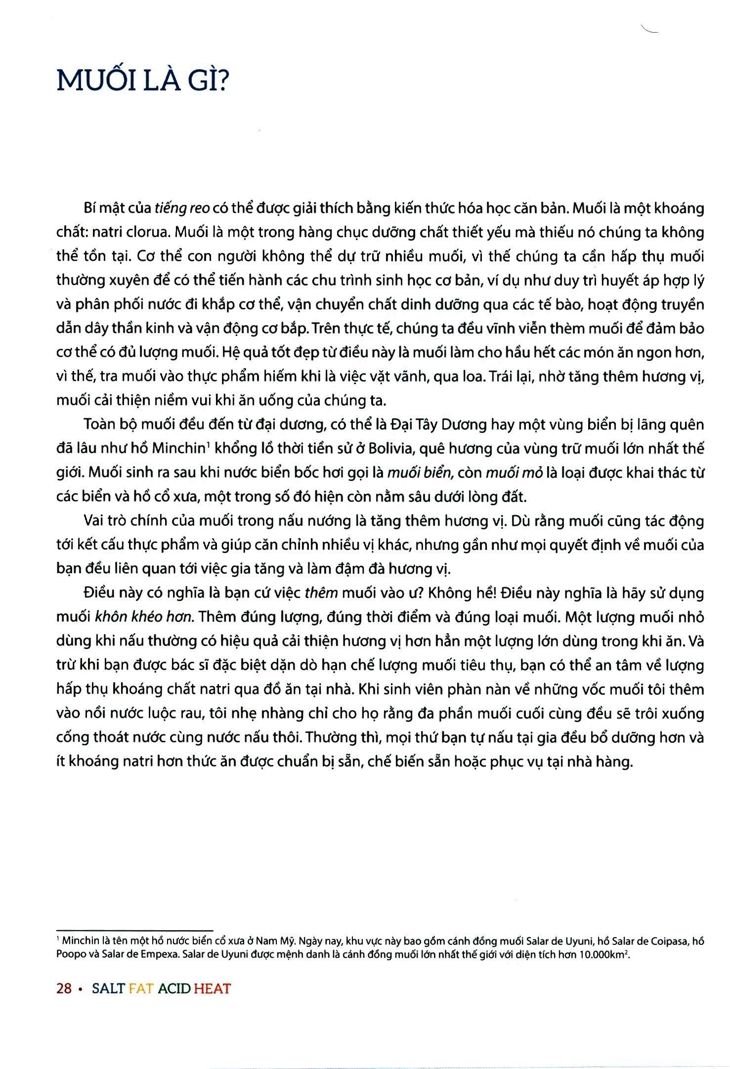 Trong một thế giới nơi hai kiệt tác nấu ăn The Joy of Cooking và How to Cook Everything thống trị, Mặn béo chua nóng đột ngột xuất hiện, với cách tiếp cận hoàn toàn mới đến từ một nghệ nhân ẩm thực tài hoa mới. Đầu bếp kiêm tác giả Samin Nosrat đã giúp đỡ và giảng dạy nhiều người, từ các đầu bếp chuyên nghiệp tới học sinh trung học, tới tác giả kiêm nhà báo Michael Pollan triết lý ẩm thực độc đáo nhưng rất đỗi giản đơn của cô. Chỉ cần nắm vững nghệ thuật vận dụng bốn yếu tố đơn giản, bao gồm Muối, để tăng cường hương vị; chất béo, để truyền tải hương vị và hình thành kết cấu; chất chua, để cân bằng hương vị; và nhiệt độ, để quyết định kết cấu cuối cùng của thức ăn - chỉ cần như thế, thì bất cứ món ăn nào bạn chế biến cũng sẽ trở thành tuyệt phẩm. Bằng cách diễn đạt và lý giải hết sức tự nhiên và chi tiết, Mặn béo chua nóng sẽ hướng dẫn và truyền cảm hứng cho một thế hệ đầu bếp mới, để họ có thể tự tin đưa ra nhiều quyết định trong gian bếp và nấu được nhiều món ăn ngon hơn, từ bất cứ nguyên liệu nào, tại bất cứ đâu và vào bất cứ lúc nào.