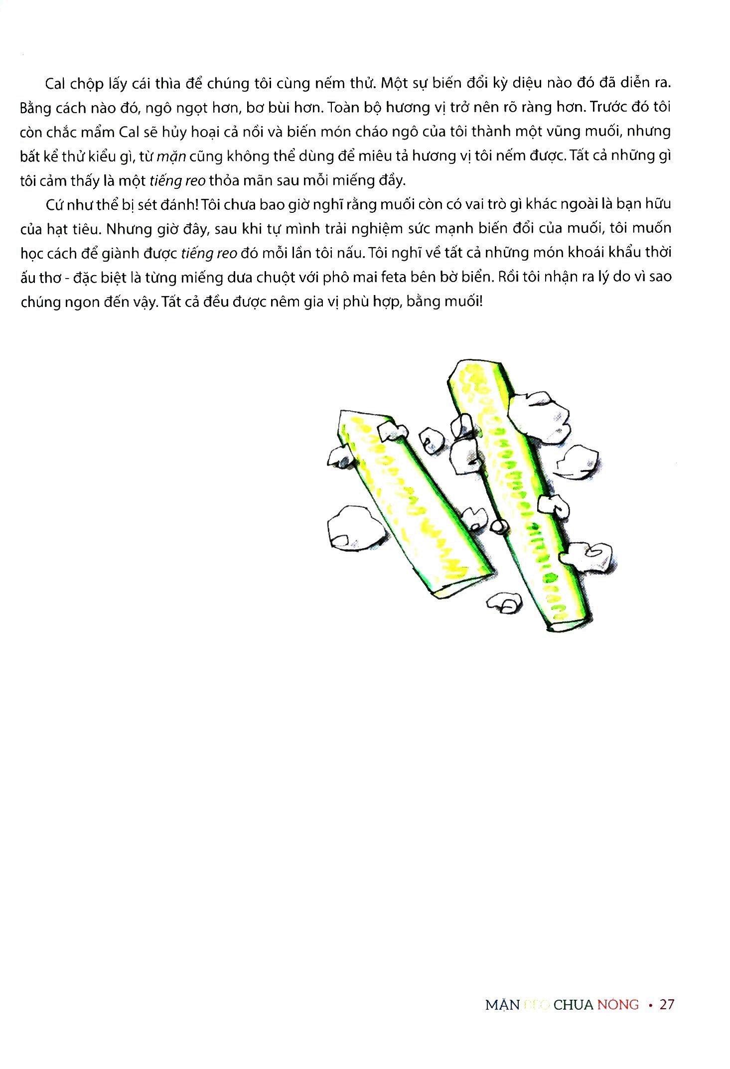 Với 150 hình minh họa, trong đó có bản đồ hương vị trên toàn thế giới rất đỗi kỳ công, do chính tay họa sĩ nổi tiếng Wendy MacNaughton vẽ, Mặn béo chua nóng sẽ trở thành kim chỉ nam cho bạn trong gian bếp. Là một tác phẩm tiêu biểu và kinh điển, Mặn béo chua nóng chắc chắn sẽ trở thành cuốn sách dạy nấu ăn yêu thích và quan trọng của bạn.
