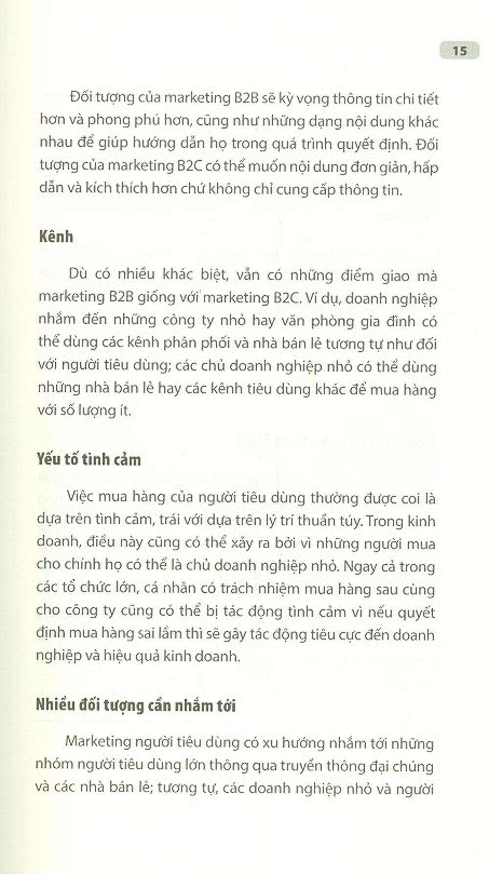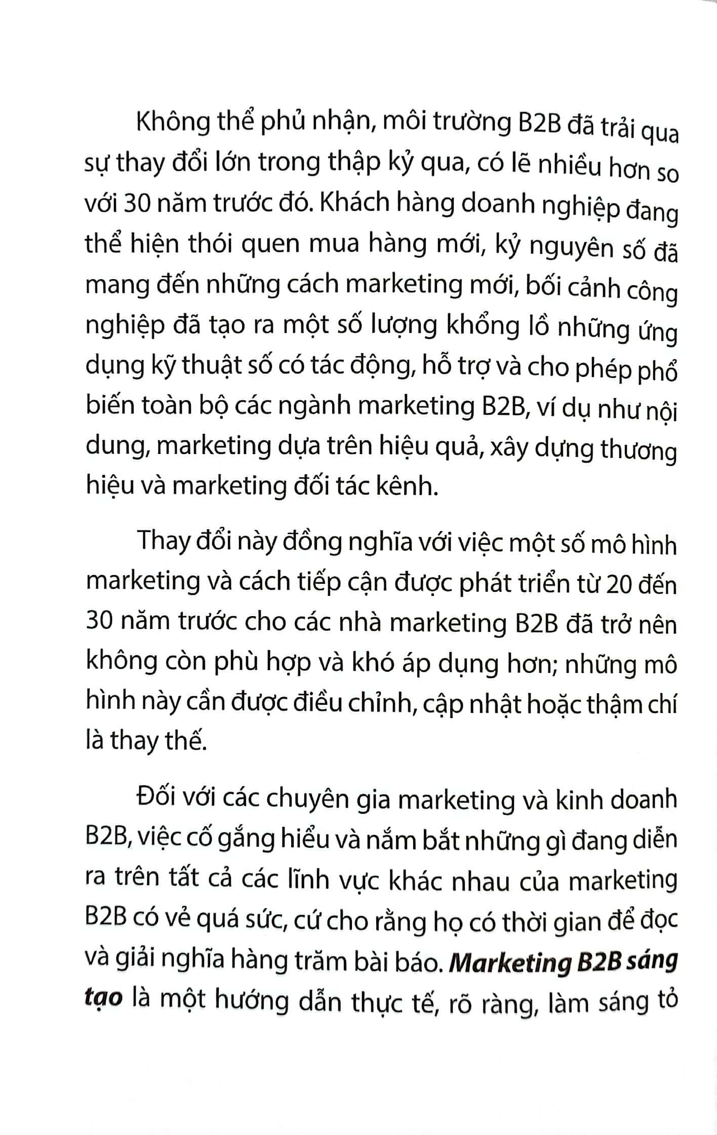 Qua ngòi bút của Simon Hall, cựu Giám đốc Marketing với hơn 20 năm kinh nghiệm điều hành cấp cao, như một trong những tiếng nói đi đầu trong giới marketing B2B, Marketing B2B sáng tạo cung cấp những thông tin và hiểu biết sâu sắc từ kinh nghiệm trực tiếp của tác giả. Với những ví dụ thực tế từ nhiều lĩnh vực đa dạng khác nhau, cộng với những thảo luận và vấn đề thời sự từ các diễn đàn và hiệp hội marketing B2B chủ chốt, các nhà marketing sẽ tìm ra cách tiếp cận, mô hình và giải pháp mới, giúp đối phó với bất kỳ thách thức nào khi làm chiến lược B2B.