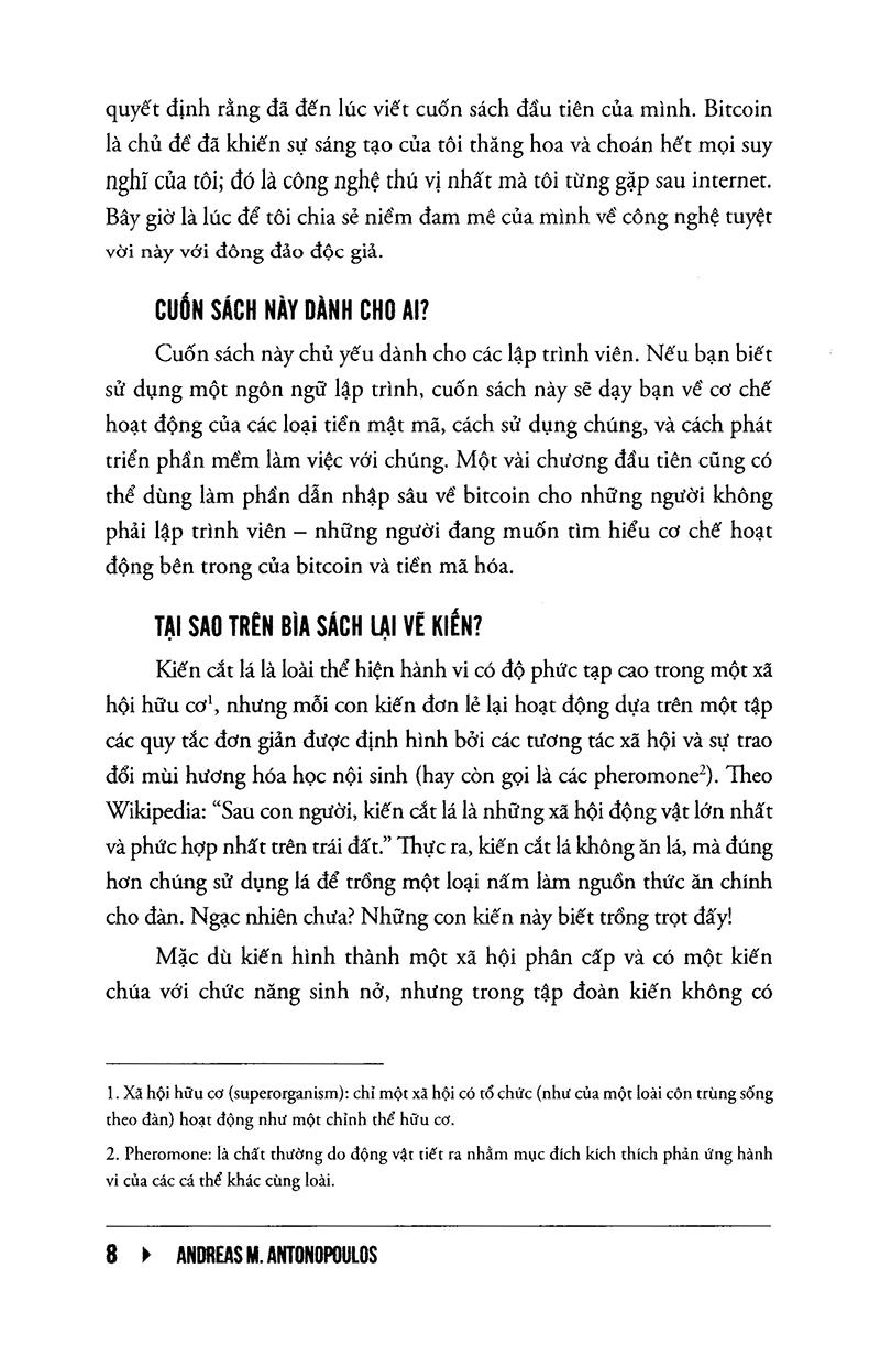 Cuốn sách này, ra đời sau hai năm Andreas “nằm vùng” trong cộng đồng bitcoin, được đông đảo các chuyên gia đánh giá là tài liệu thiết yếu dành cho bất kỳ ai muốn tìm hiểu các kiến thức nền tảng về tiền mã hóa, cách thức vận hành về mặt kỹ thuật của tiền mã hóa, cũng như cách phát triển các phần mềm làm việc với loại tiền này.