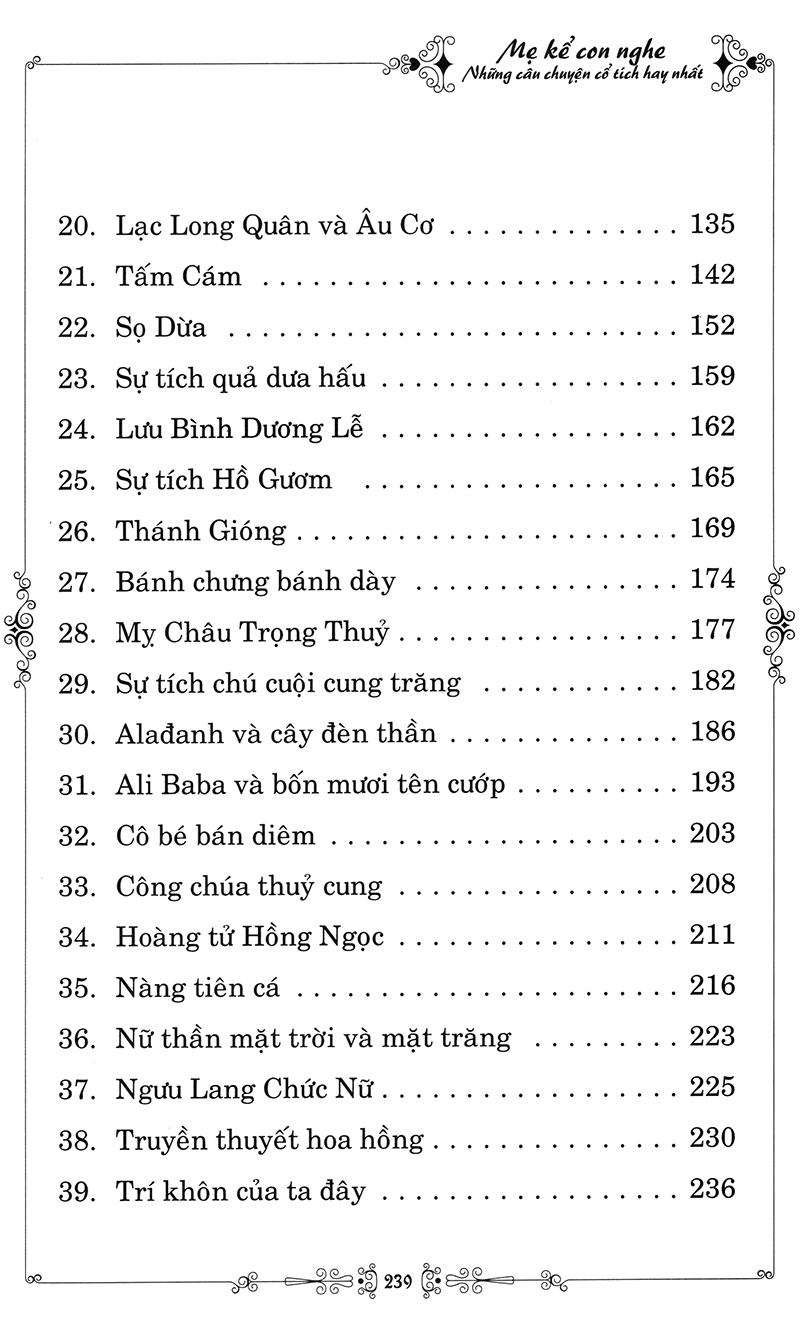 Những câu chuyện cổ tích mẹ kể con nghe trước khi đi ngủ đã trở thành một tập sách hay và bổ ích đối với các bé yêu của bạn. Với 39 câu chuyện cổ tích hấp dẫn quen thuộc như: Cây tre trăm đốt, cây khế, Sọ Dừa, Thánh Gióng, sự tích Hồ Gươm, Lạc Long Quân và Âu Cơ, Bánh Chưng Bánh Dày, Nàng Bạch Tuyết và bảy chú lùn, Cô bé quàng khăn đỏ, Chú mèo đi hia…