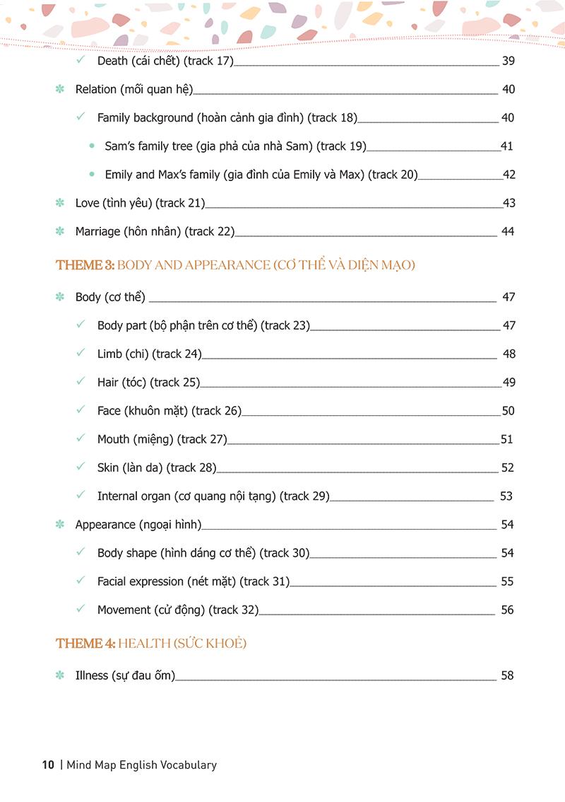 Sách rất đẹp, nội dung thì mình mới đọc sơ qua thì thấy từ vựng chia theo chủ đề, và mỗi trang sẽ là sơ đồ tư duy của 1 cái mảng nào trong chủ đề đó, cũng rất hay, có thể phù hợp cho các bạn từ cấp 2 trở lên nha, phía dưới sơ đồ tư duy sẽ là một vài ví dụ đặt câu với các từ ở trên, nhìn chung chủ đề cũng rất basic, nhưng mà có rất là nhiều từ mình k nghĩ đến và k biết tới luon 👍🏻👍🏻