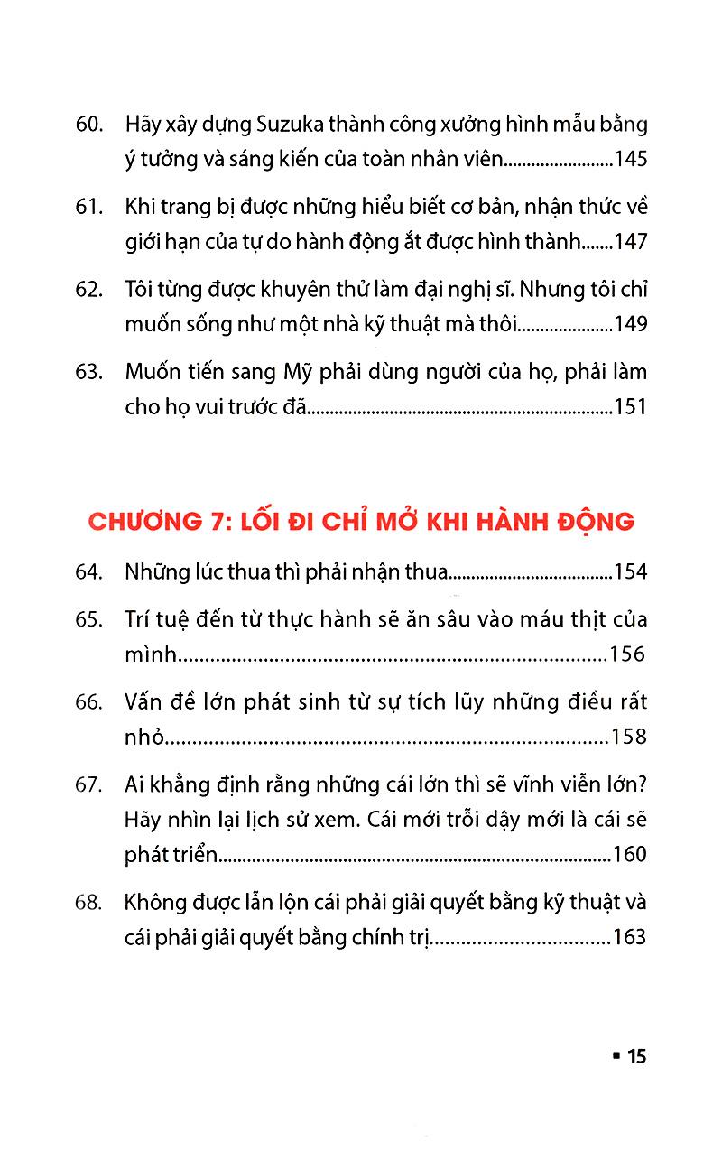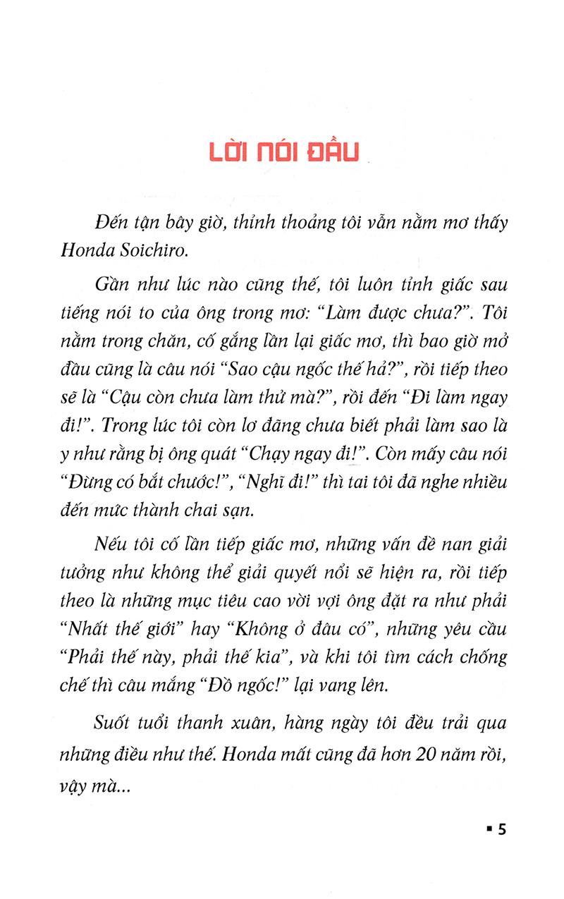 Đến tận bây giờ, thỉnh thoảng tôi vẫn nằm mơ thấy Honda Soichiro. Gần như lúc nảo cũng thế, tôi luôn tỉnh giấc sau tiếng nói to của ông trong mơ: "Làm được chưa?". Tôi nằm trong chăn, cố gắng lần lại giấc mơ, thì bao giờ mở đầu cũng là câu nói "Sao cậu ngốc thế hả?", rồi tiếp theo sẽ là "cậu còn chưa làm thử mà?", rồi đến "Đi làm ngay đi!". Trong lúc tôi còn lơ đãng chưa biết phải làm sao là y như rằng bị ông quát "chạy ngay đi!". Còn mấy câu nói "Đừng có bắt chước!" , "Nghĩ đi!" thì tai tôi đã nghe nhiều đến mức thành chai sạn. Nếu tôi cố lần tiếp giấc mơ, những vấn đề nan giải tưởng như không thể giải quyết nổi sẽ hiện ra, rồi tiếp theo là những mục tiêu cao vời với ông đặt ra như phải "Nhất thế giới" hay "Không ở đâu có", những yêu cầu "Phải thế này, phải thế kia", và khi tôi tìm cách chống chế thì cậu mắng " Đồ ngốc!" lại vang lên. Suốt tuổi thanh xuân, hàng ngày tôi đều trải qua những điều như thế. Honda mất cũng đã hơn 20 năm rồi vậy mà...