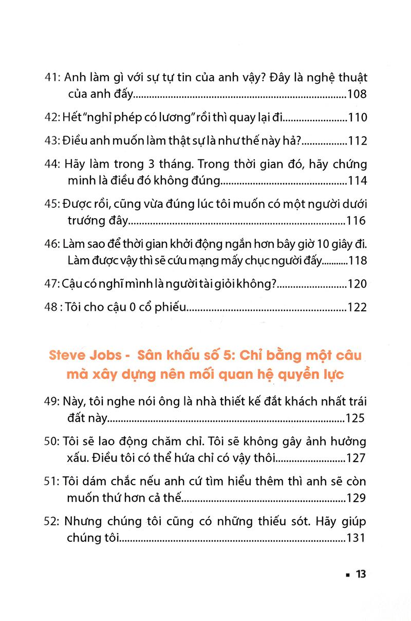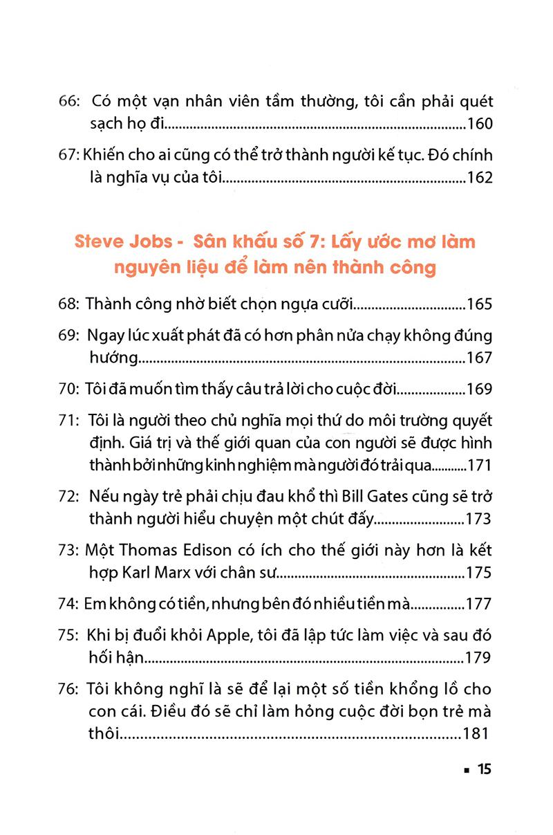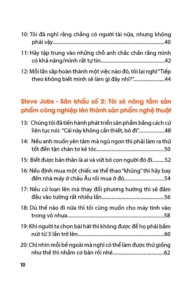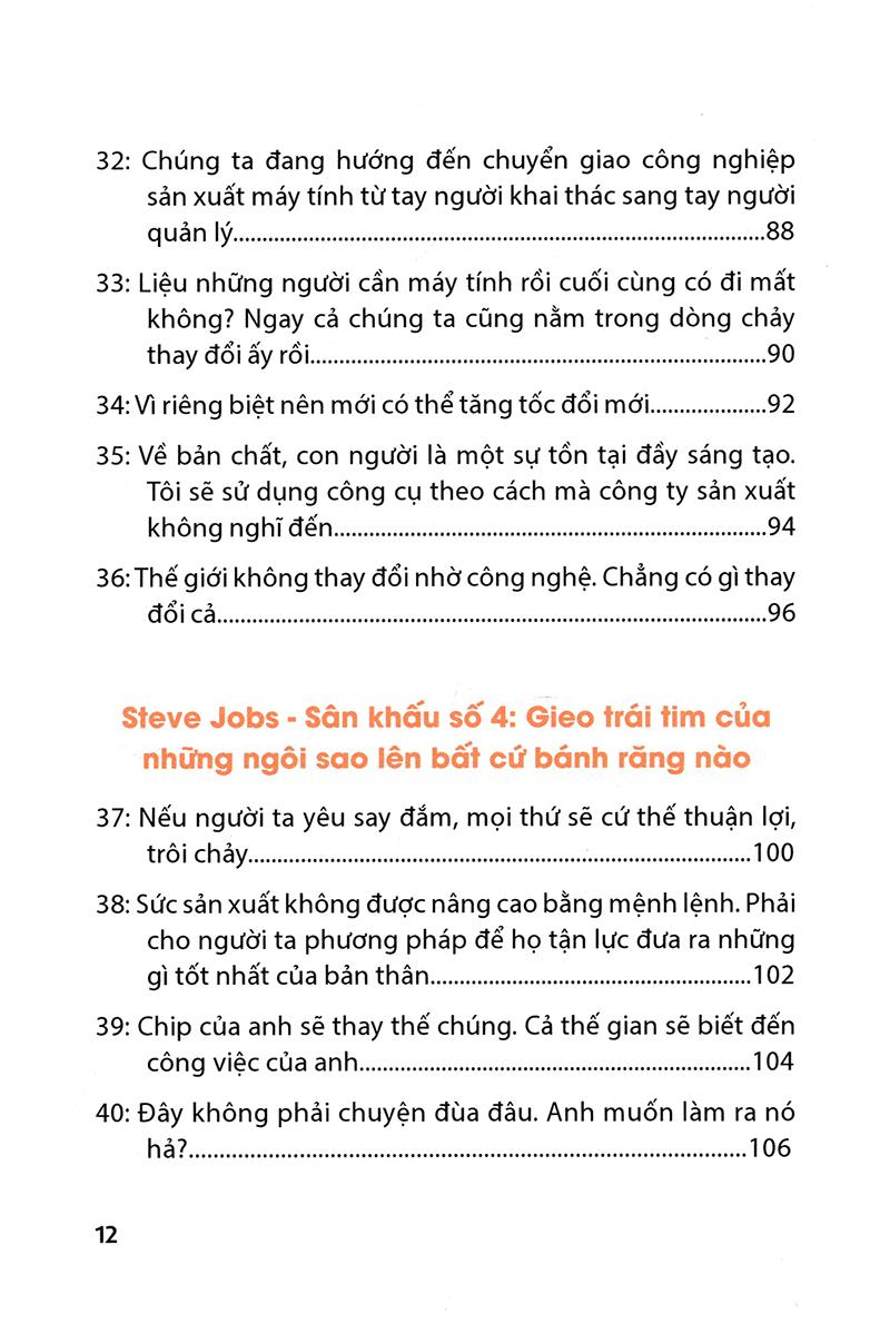 Một số bài học mình rút ra được từ cuốn sách: 1. Nếu hôm nay là ngày cuối cùng của cuộc đời, liệu việc bạn định làm có thực sự là việc bạn muốn làm hay không? 2. Tìm ra sức mạnh mà mình không có từ tập thể. - Tập hợp những người giỏi nhất, phát huy cái tốt nhất của tất cả mọi người để đạt kết quả tốt nhất. Đó là sức mạnh của làm việc nhóm. 3. Đừng xem các sản phẩm công nghiệp chỉ là các thiết bị máy móc bình thường mà cần phải thả vào nó những nét đẹp của nghệ thuật. - Các sản phẩm công nghệ tuyệt vời là những sản phẩm mà người bình thường đều có thể sử dụng dễ dàng. - Một sản phẩm tốt không phải là không còn gì để thêm mà là không còn gì để cắt bớt mà vẫn phục vụ được cho hầu hết tất cả mọi người. 4. Thứ cần hướng đến không phải là trên trung bình mà là trên cả tốt nhất. - An toàn là cái bẫy nguy hiểm số một. 5. Giao trái tim của ngôi sao lên bất cứ bánh răng nào. - Khi đã yêu say đắm thì không có gì là khó khăn. 6. Xây dựng những mối quan hệ bền vững bằng những lời nói ngắn gọn. 7. Xuất phát từ số 0 thì còn gì để mất đâu. - Cầy sồi lớn sẽ có cái rễ to mà cái rễ ấy lại được tạo bằng nhữnng thất bại. 8. Ước mơ là nguyên liệu để tạo nên thành công. - Thế giới này cần những người hành động hơn là những người chỉ nói. Tốc độ giao hàng và chất lượng sản phẩm của tiki thì chưa bao giờ làm mình thất vọng.