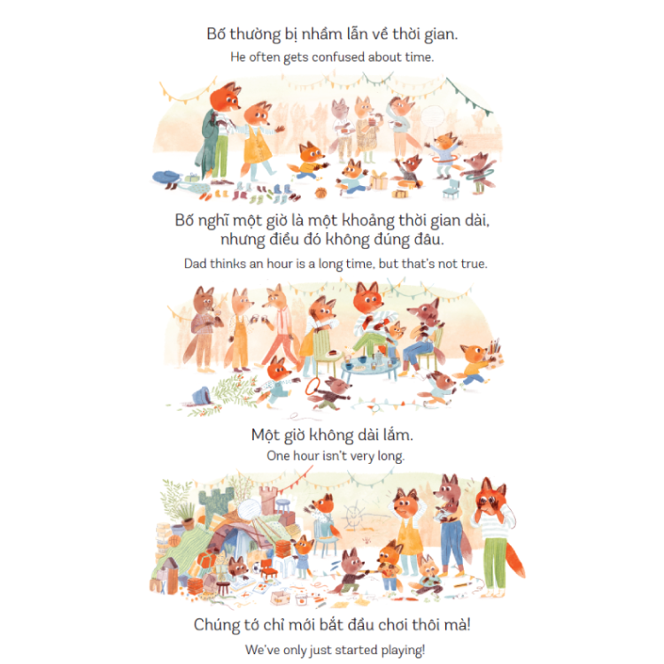 - Các bạn nhỏ đã bao giờ gặp phải trường hợp bố mẹ vội vàng nhắc nhở “Nhanh lên con, sắp muộn học rồi!”, nhưng bản thân mình lại thấy “Con còn nhiều thời gian lắm, đủ để đọc hết một cuốn sách cơ” chưa? Gia đình bạn cáo cũng giống y như vậy, cách tính thời gian của cáo nhỏ và bố rất khác nhau. Vậy thì cách tính của ai mới là chính xác nhất nhỉ?