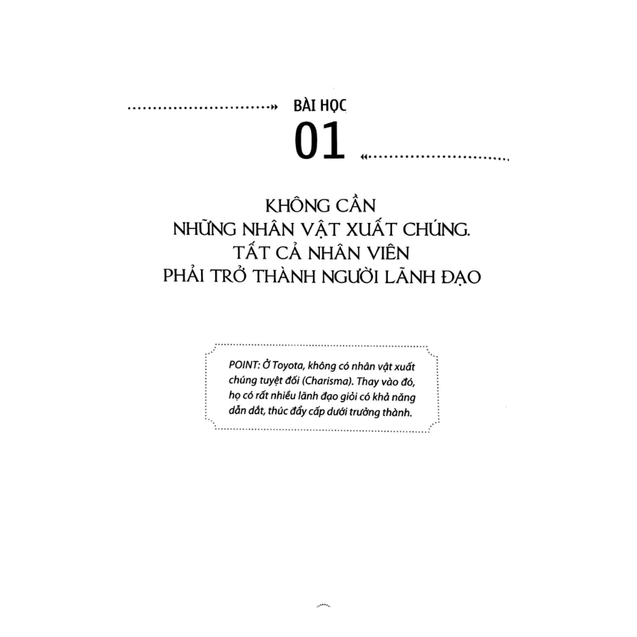 xây dựng công xưởng vững mạnh. Tuy nhiên, yếu tố cần thiết để có một công xưởng vững mạnh không phải là chỉ đào tạo một nhà lãnh đạo xuất sắc duy nhất. Toyota coi trọng đào tạo những lãnh đạo ưu tú (số nhiều).