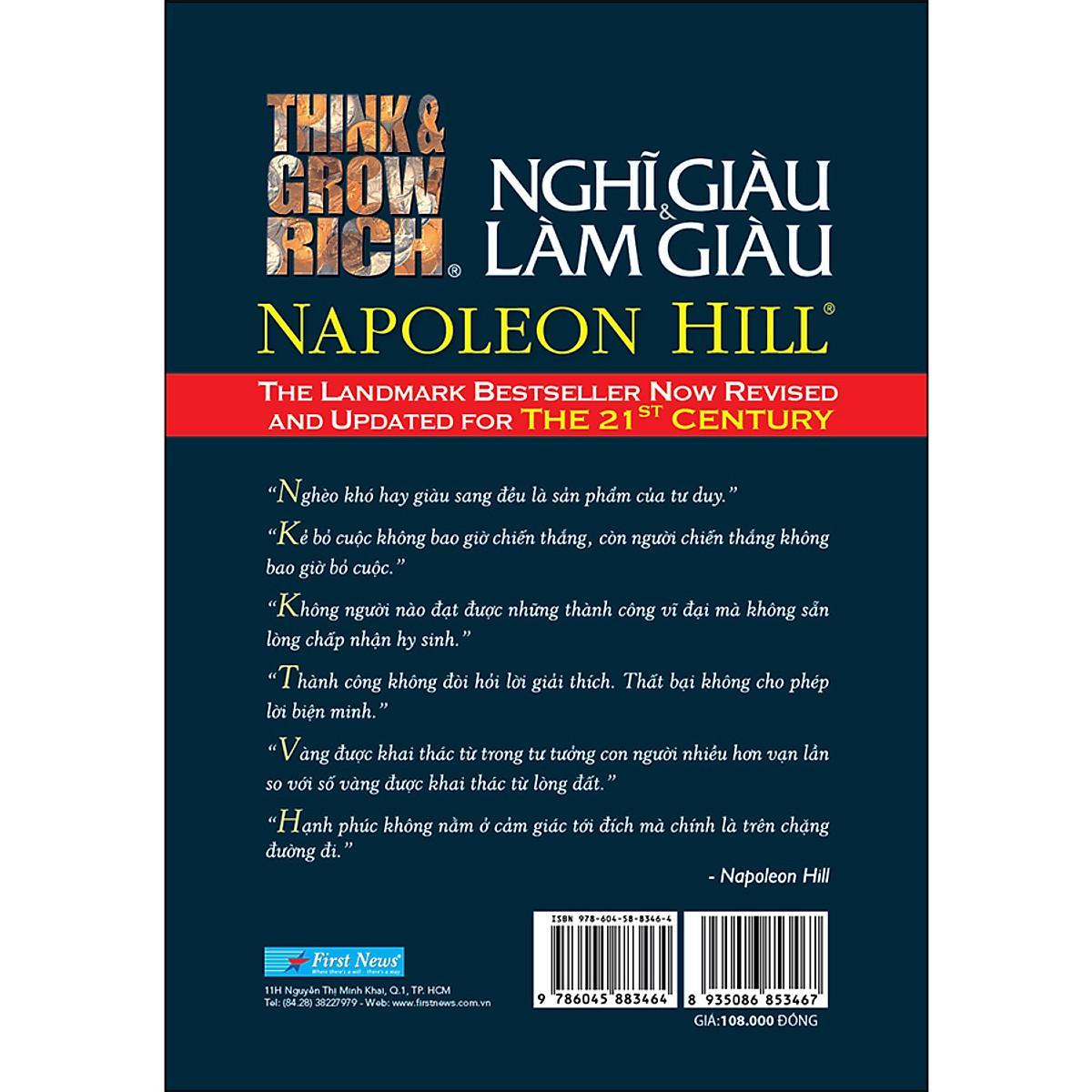 Think and Grow Rich - Nghĩ giàu và Làm giàu là cuốn sách đầu tiên đưa ra triết lý thành đạt - một triết lý đầy đủ và toàn diện về thành công của cá nhân, đồng thời cung cấp cho bạn phương pháp để tạo một ý thức thành công cũng như đưa ra kế hoạch sơ bộ và chi tiết để đạt được thành công đó. Các bí quyết thành công được đề cập đến trong cuốn sách này có thể được đúc kết ngắn gọn: tất cả bắt nguồn từ cách nghĩ. Do đó, cuốn sách này không chỉ thay đổi những điều bạn nghĩ mà còn có thể thay đổi cả cách nghĩ của bạn; không dừng lại ở việc chỉ ra cho bạn thấy bạn phải làm gì mà còn vạch cho bạn biết phải làm điều đó như thế nào để đạt được khát vọng của mình. Ra mắt bạn đọc với phiên bản cao cấp lần này, cuốn sách thay đổi nhiều về hình thức thiết kế bìa cứng, màu nâu đen, chữ vàng ánh kim
