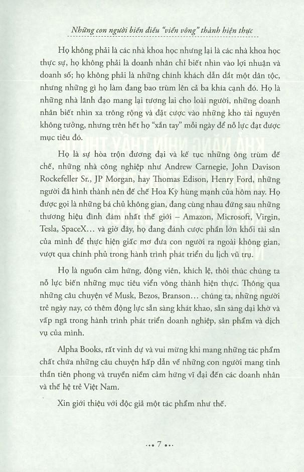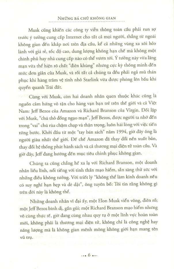 Những bá chủ không gian này đang cùng nhau đứng sau những thương hiệu lớn nhất thế giới – Amazon, Microsoft, Virgin, Tesla, PayPal – những thương hiệu đã làm gián đoạn các ngành từ bán lẻ đến thẻ tín dụng đến hàng không. Và giờ đây, họ đang đánh cược phần lớn khối tài sản khổng lồ của mình để đưa số đông ra ngoài không gian, vượt qua chính phủ trong hành trình phát triển du lịch không gian.