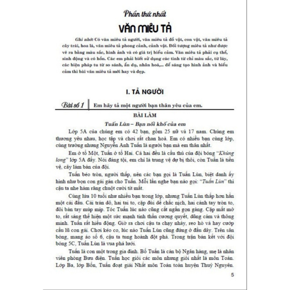 Sách - Những bài văn đạt điểm cao của học sinh giỏi lớp 5 (Ha) Bộ sách Những bài văn đạt điểm cao của học sinh giỏi Tiểu học hướng tới độc giả là các em học sinh lớp 2, lớp 3, lớp 4, lớp 5. Bộ sách này tuyển chọn những bài văn hay, bài văn đặc sắc của học sinh giỏi, đã đạt điểm cao, đã giành được giải cao trong các kì thi học sinh giỏi cấp quận / huyện, cấp tỉnh / thành phố. Hầu hết các bài văn ấy đều có tên tác giả, tên trường cụ thể; mỗi bài văn đều phản ánh tâm hồn tuổi thơ đối với cảnh vật, sự vật, sự việc và con người mà các em nói tới. Những bài văn đạt điểm cao của học sinh giỏi lớp 2, lớp 3 gồm có 3 phần: văn miêu tả, văn kể chuyện, cảm thụ thơ văn. Những bài văn đạt điểm cao của học sinh giỏi lớp 4, lớp 5 gồm có 4 phần: văn miêu tả, văn kể chuyện, văn viết thư, cảm thụ thơ văn. Đây không phải là “văn mẫu” mà đích thực là “những bông hoa đẹp” của tuổi thơ. Mong các em đón nhận và đọc những bài văn ấy với tinh thần yêu thích văn học, đọc để mở rộng tâm trí, khơi dậy sự tìm tòi, sáng tạo. Và cần nhớ rằng: “Không thầy đố mày làm nên”, đồng thời hiểu rằng: “Học thầy không tày học bạn”. Đã có rất nhiều bài văn đặc sắc được gửi về cho chúng tôi từ hàng nghìn thầy giáo, cô giáo, các vị phụ huynh và các em học sinh giỏi nhưng trong cuốn này, chúng tôi chỉ mới giới thiệu được một phần nhỏ mà thôi. Chúng tôi sẽ giới thiệu tiếp trong những Tuyển chọn khác. Nhân dịp bộ sách 4 cuốn Những bài văn đạt điểm cao của học sinh giỏi Tiểu học được xuất bản, chúng tôi xin trân trọng gửi lời cảm ơn đến các thầy giáo, cô giáo, các vị phụ huynh và những em học sinh (tác giả bài văn tuyển chọn trong cuốn sách này) đã gửi cho chúng tôi nhiều tài liệu, tư liệu quý báu. Hi vọng bộ sách Những bài văn đạt điểm cao của học sinh giỏi Tiểu học sẽ trở thành người bạn thân thiết, tin cậy của các em học sinh tiểu học gần xa. Chúc các em luôn là con ngoan, trò giỏi. Công ty phát hành Nhà Sách Hồng Ân Năm xuất bản: 2024 Số trang 168 Nhà xuất bản Nhà Xuất Bản Đại Học sư phạm Tác giả:nhiều tác giả
