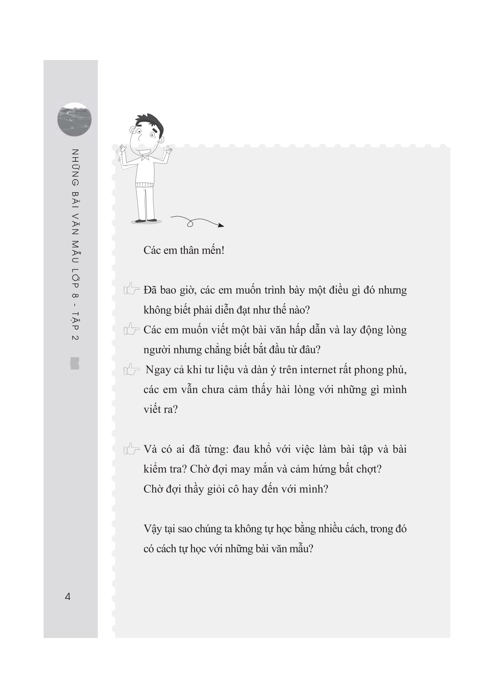 Vậy tại sao các em không tự học bằng nhiều cách, trong đó có cách tự học với những bài văn mẫu? Với mong muốn giúp đỡ cho các em học sinh lớp 8 có được tài liệu tham khảo bám sát với các bài học trên lớp và mở rộng thêm nhiều kiến thức, chúng tôi xin giới thiệu tới các em cuốn sách “Những bài văn mẫu lớp 8”.