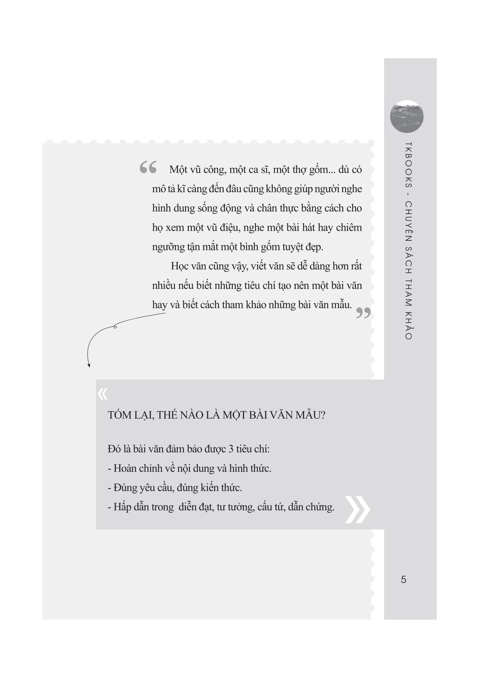 Văn mẫu không phải là một cái phao cứu trợ, không phải là thứ để các em sao chép. Văn mẫu là một công cụ hữu ích cho quá trình tự học nếu các em biết dùng đúng cách. Cuốn sách này sẽ cung cấp phương pháp cụ thể cho từng kiểu bài, giúp các em có thể vận dụng linh hoạt, giải quyết tốt các đề văn khác nhau mà không lúng túng, bỡ ngỡ. Từ phương pháp các em dễ dàng hình thành cách tư duy để giải quyết một vấn đề cụ thể.
