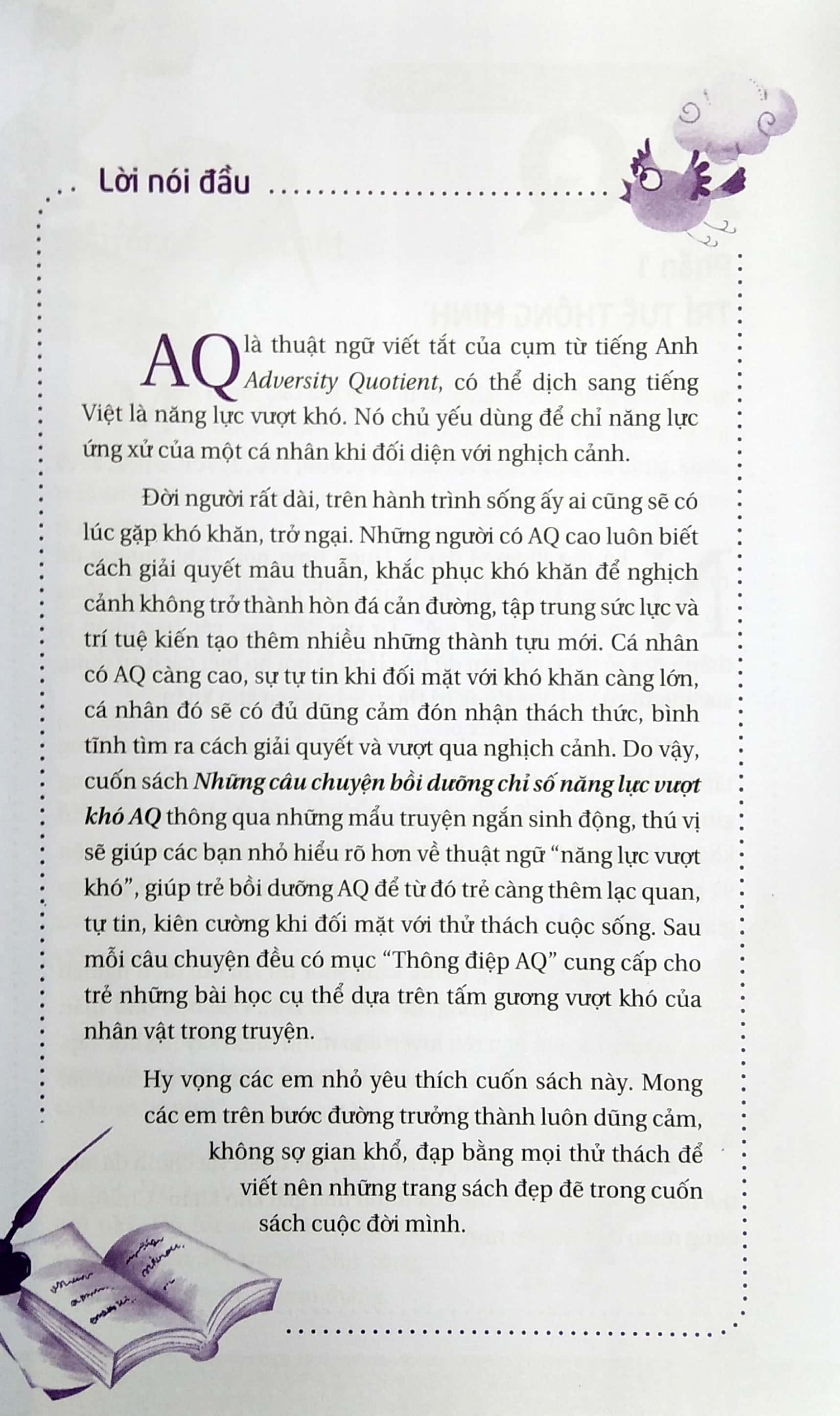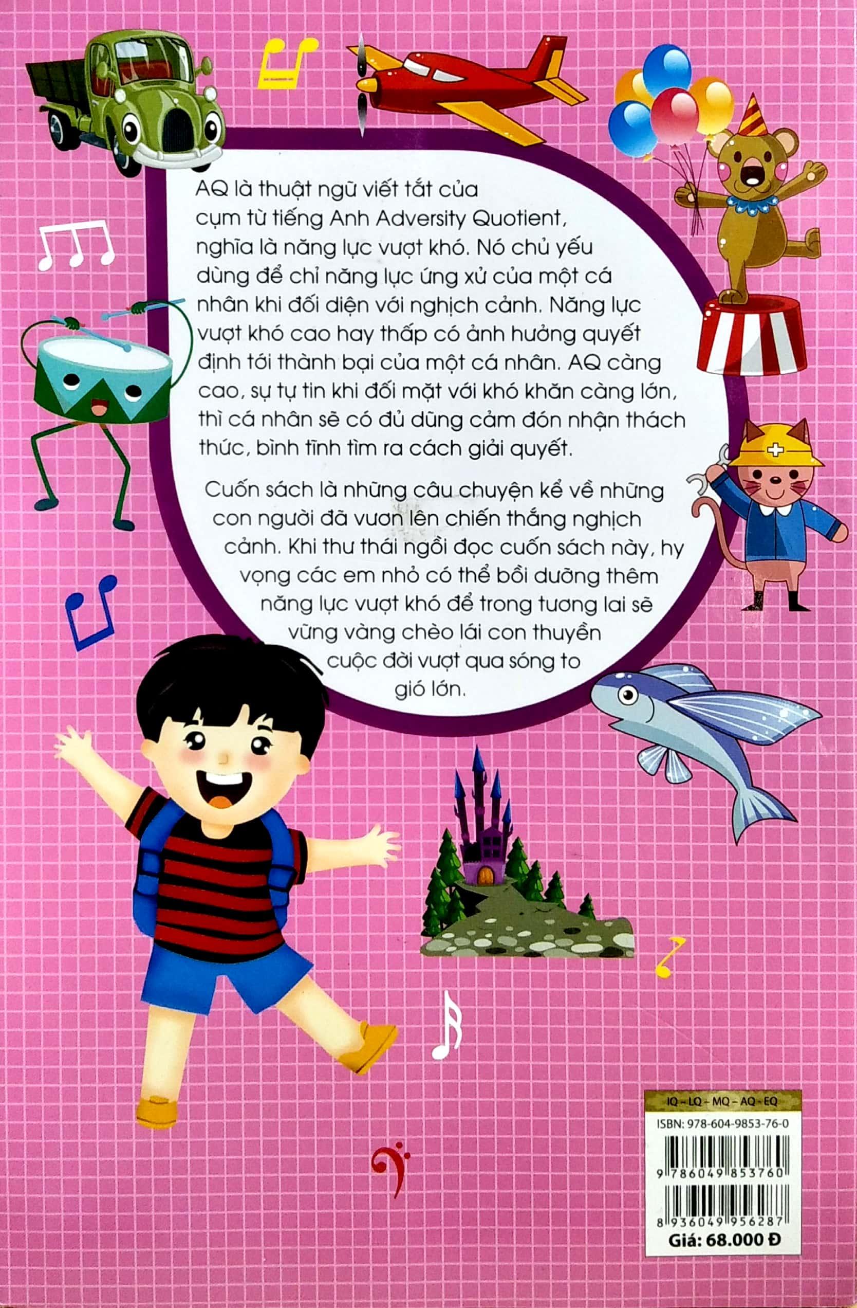 AQ là thuật ngữ viết tắt của cụm từ tiếng Anh Adversity Quotient, nghĩa là năng lực vượt khó. Nó chủ yếu dùng để chỉ năng lực ứng xử của một cá nhân khi đối diện với nghịch cảnh. Năng lực vượt khó cao hay thấp có ảnh hương quyết định tới thành bại của một cá nhân. AQ càng cao, sự tự tin khi đối mặt với khó khăn càng lớn, thì cá nhân sẽ có đủ dũng cảm đón nhận thách thức, bình tĩnh tìm ra cách giải quyết.Cuốn sách là những câu chuyện kể về những con người đã vươn lên chiến thắng nghịch cảnh. Khi thư thái ngồi đọc cuốn sách này, hy vọng các em nhỏ có thể bồi dưỡng thêm năng lực vượt khó để trong tương lai sẽ vừng vàng chèo lái con thuyền cuộc đời vượt qua sóng to gió lớn.