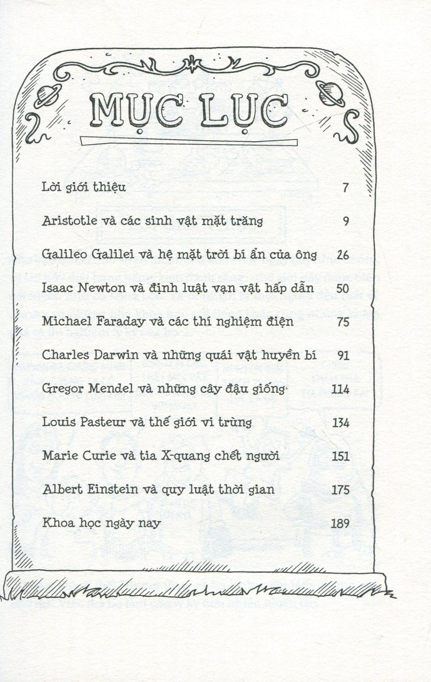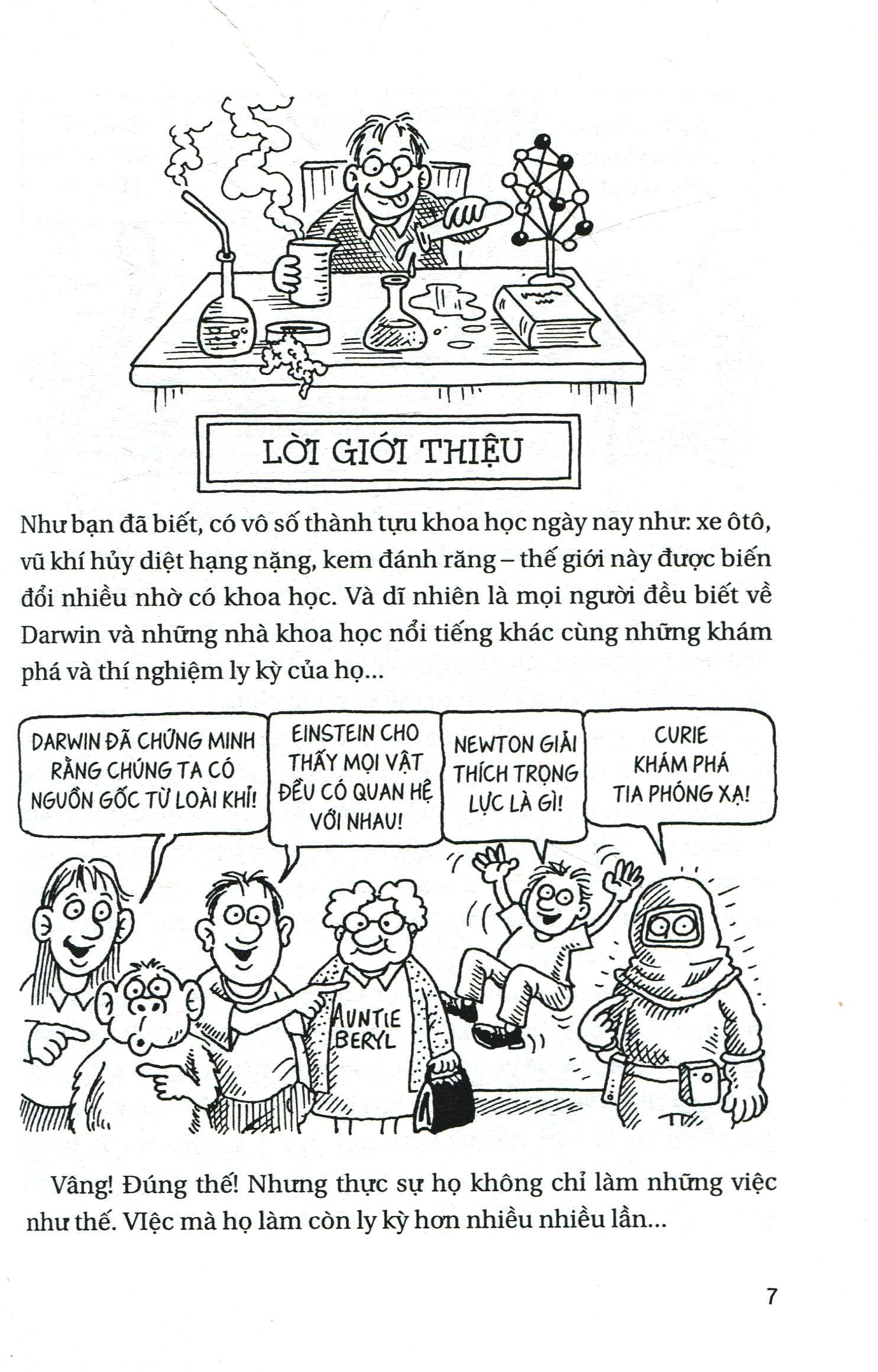 Cuộc đời, tính cách cũng như quá trình sáng tạo khoa học của các nhà khoa học tiên phong thế giới như Darwin, Galileo, Curie, Newton…. Được khắc họa sinh động, qua ngòi bút của Dr Mikie Goldsmith những vấn đề khoa học được trình bày trở nên nhẹ nhàng, vui nhộn, giúp bạn đọc dễ dàng tiếp cận những khái niệm khoa học, giúp độc giả xây dựng tình yêu khoa học cũng như khơi gợi lòng ham thích học tập và khám phá khoa học.