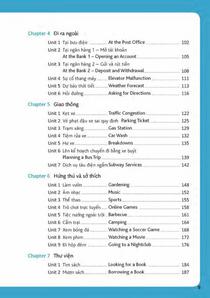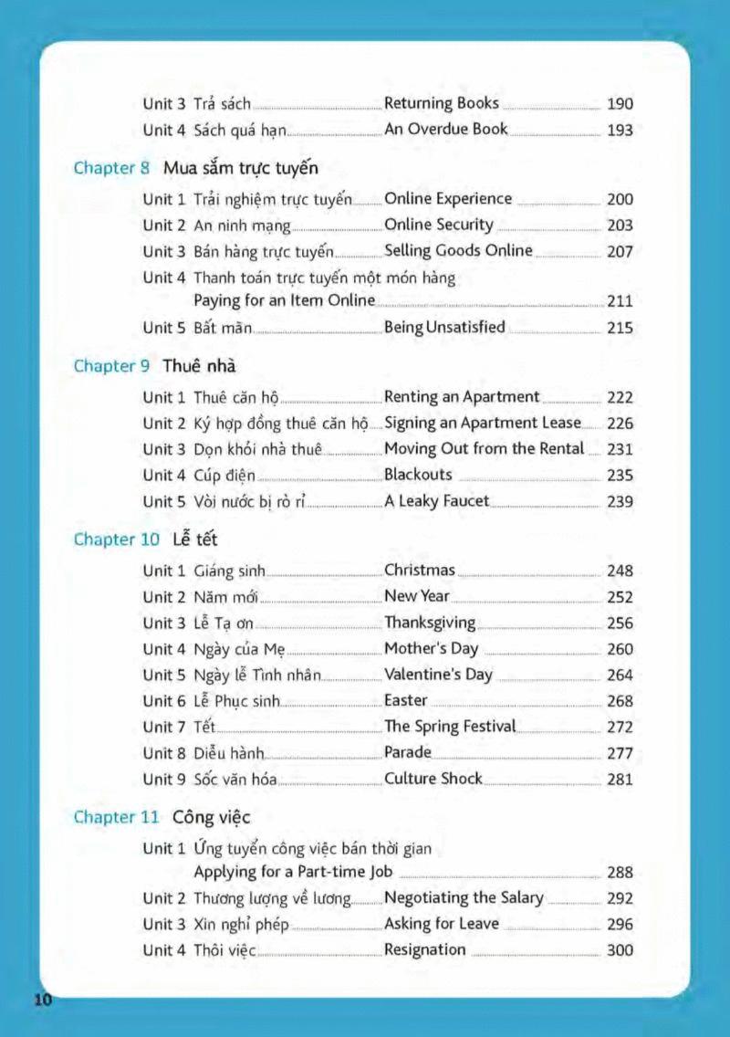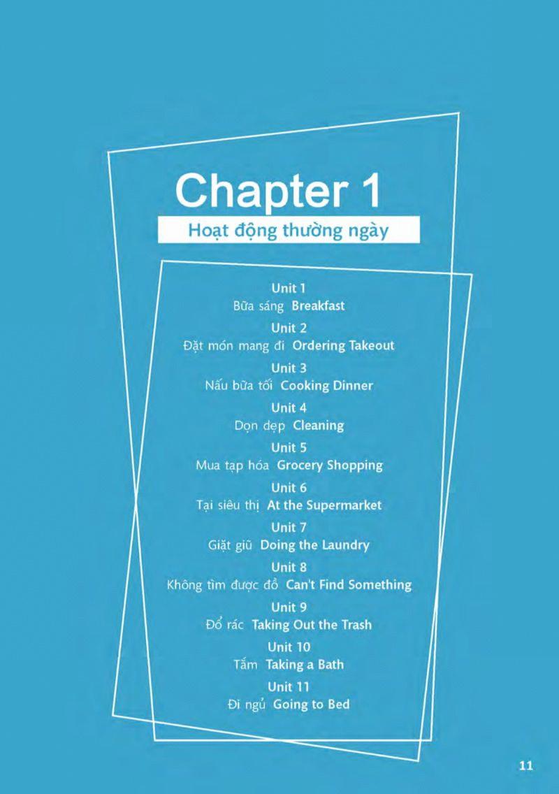 Sách có 11 chương về các chủ đề cần thiết như những hoạt động thường ngày, thói quen, sức khỏe, mua sắm, công việc, lễ Tết. Mục tiêu của sách là giúp bạn giao tiếp một cách lưu loát bằng tiếng Anh.