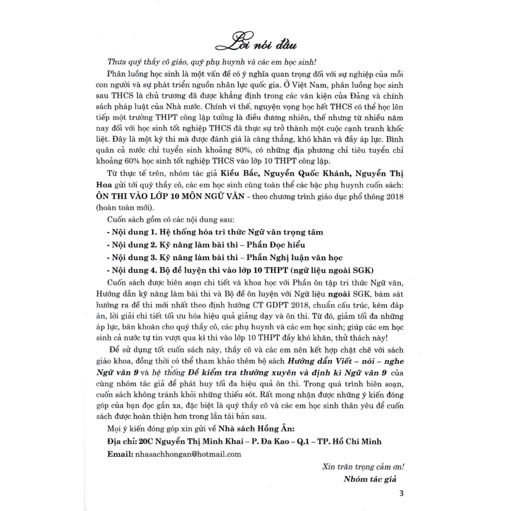 Từ thực tế trên, nhóm tác giả Kiểu Bắc, Nguyễn Quốc Khánh, Nguyễn Thị Hoa gửi tới quý thầy cô, các em học sinh cùng toàn thể các bậc phụ huynh cuốn sách: ÔN THI VÀO LỚP 10 MÔN NGỮ VĂN - theo chương trình giáo dục phổ thông 2018 (hoàn toàn mới).