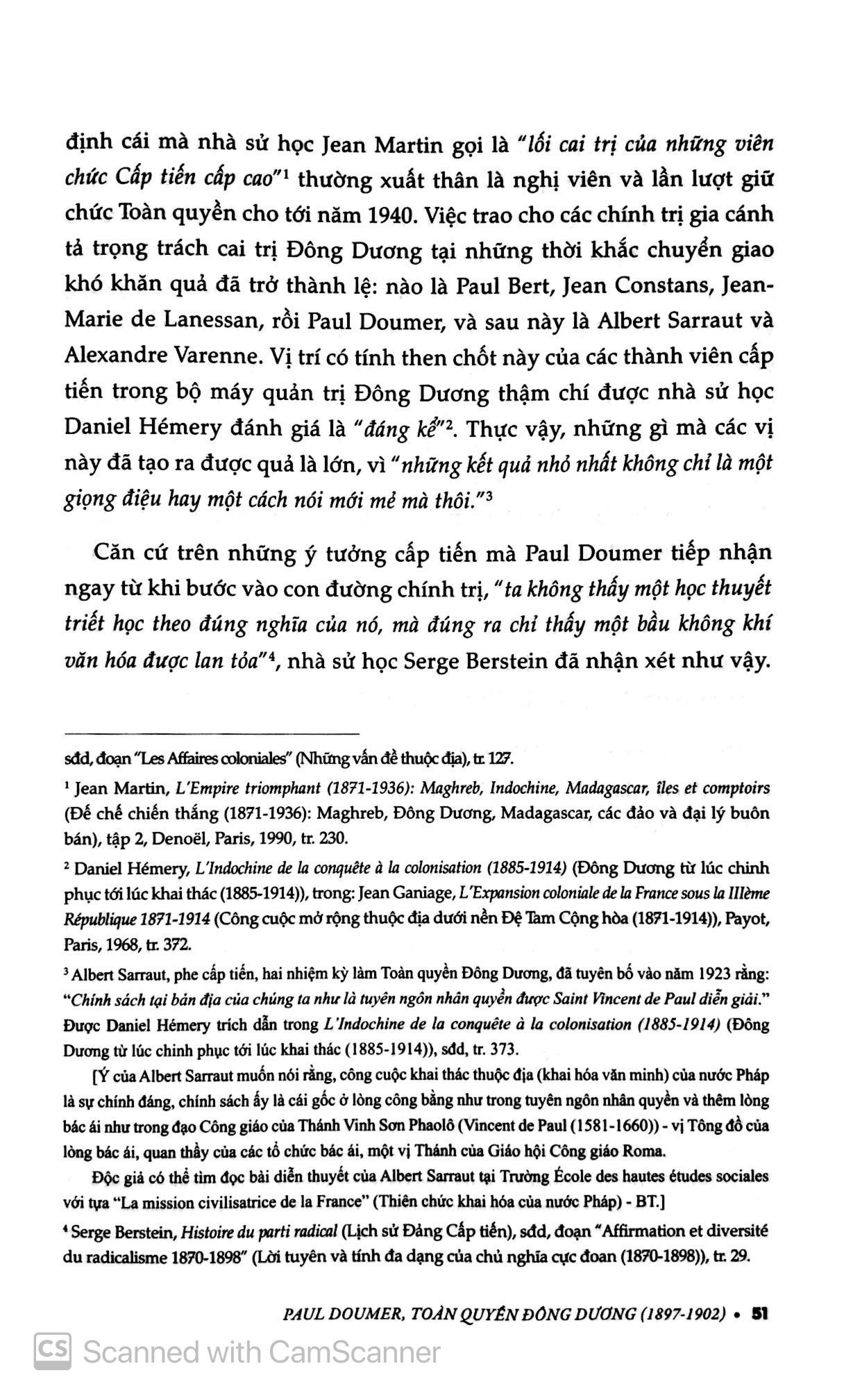 Paul Doumer- Toàn Quyền Đông Dương (1897- 1902)- Bàn Đạp Thuộc Địa- Amaury Lorin "Ý tưởng làm cuốn sách này ra đời từ chính sự tích lũy nhiều trải nghiệm và khám phá bản thân tôi" "Sứ mệnh của Paul Doumer tại Đông Dương rõ ràng không hề tách rời với bối cảnh chung cần phải nhắc lại này. Thực vậy, Paul Doumer, một người gắn bó chặt chẽ với thời đại của mình, khi chiến tranh năm 1870 bùng phát, ông mới mười ba tuổi. Ông thuộc thế hệ sinh ra trước năm 1871. Chiến tranh Pháp- Đức ập đến vào lúc thiếu thời của ông và hẳn đã để lại dấu ấn sâu đậm trong ký ức của chàng thiếu niên, dẫu lúc đó còn quá trẻ để có thể tham gia." "Quan điểm cai trị của Paul Doumer thật đơn giản: cần phải làm việc nhiều hơn là kiểm soát, từ giờ trở đi cần phải tạo động lực và do vậy cần phải trực tiếp đảm nhận việc."