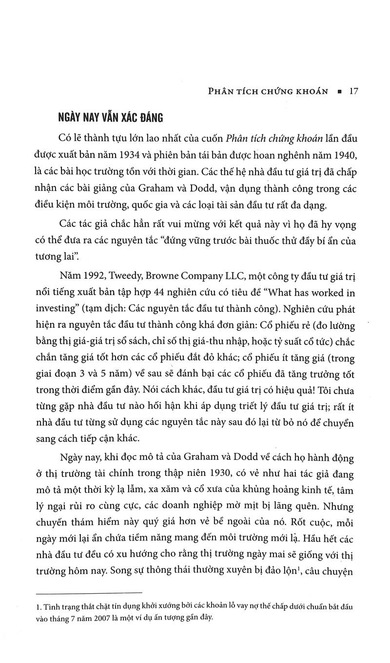 Với 8 chương sách, Phân tích chứng khoán không chỉ đưa ra những bài học vô giá trong đầu tư giá trị mà còn khiến các nhà đầu tư có được sự tỉnh táo, lựa chọn khôn ngoan khi đối mặt với sự biến động thất thường trong quá trình đầu tư.