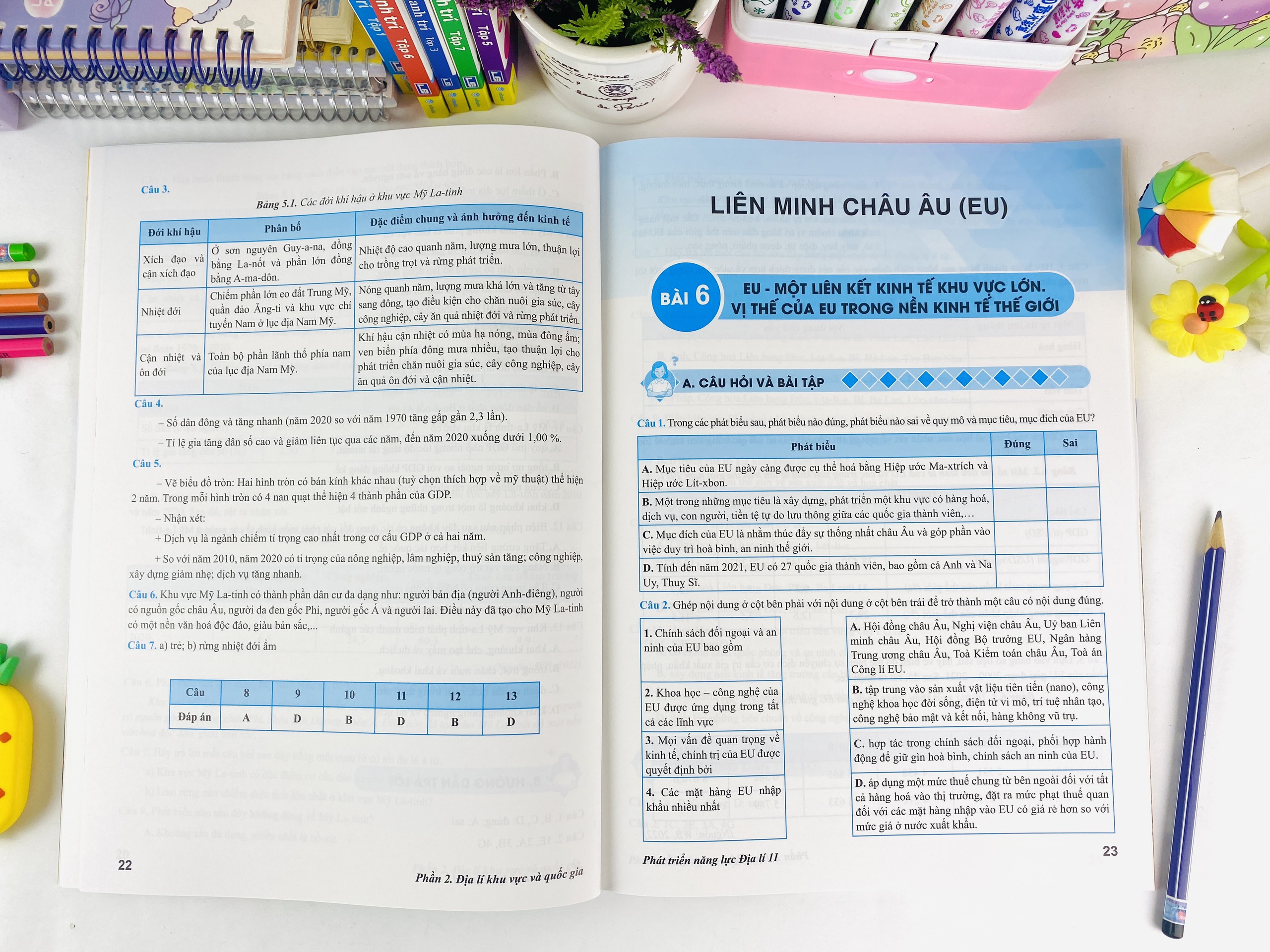 Sau mỗi bài học trên lớp, các em thực hành các câu hỏi, bài tập theo sách sẽ giúp phát triển năng lực tự học, tự nghiên cứu và các phẩm chất, năng lực đị./a lí theo yêu cầu của chương trình quy định, giúp học tốt môn Đị./a lí.