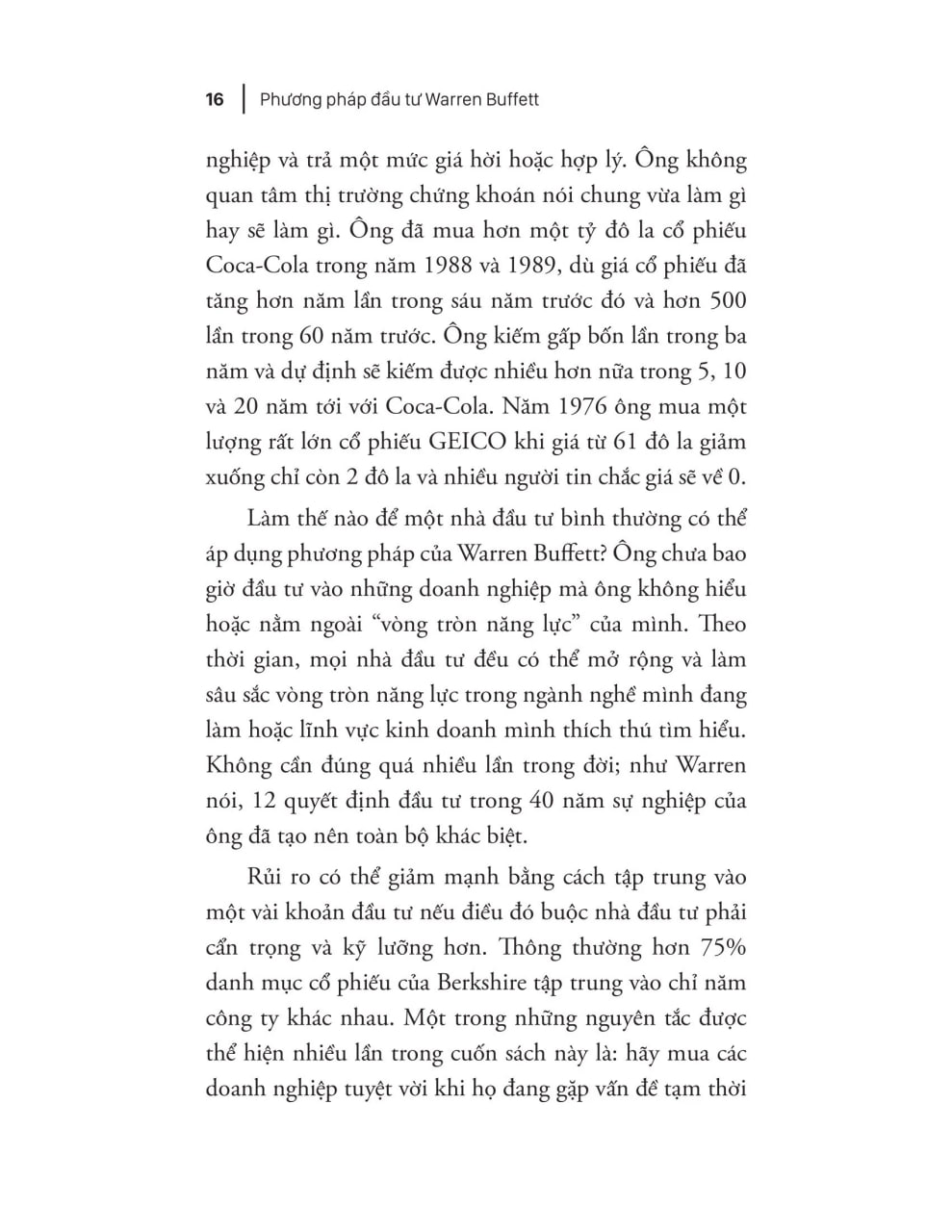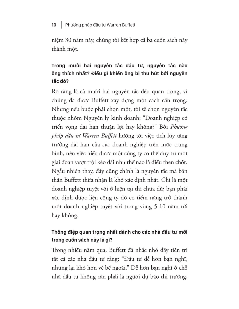Là người ủng hộ trường phái giá trị, mình nhận thấy rằng đây là một cuốn sách khá hay, nên đọc. Sách nhắc chúng ta rằng có bốn điểm chính cần lưu ý khi xuống tiền cho một công ty nào đó. 1. Nguyên lý kinh doanh: bạn hiểu công ty này hay không, và nó có triển vọng không? 2. Nguyên lý quản lý: Ban quản lý của công ty có thật sự tốt, quan tâm lợi ích của cổ đông, và tỉnh táo trong các quyết định kinh doanh? 3.Nguyên lý tài chính: Nắm rõ một vài chỉ số lợi nhuận như lợi nhuận biên, lợi nhuận trên VCP, LN trên VCSH và mức độ sinh lợi của lợi nhuận giữ lại. 4. Nguyên lý giá trị: định giá cổ phiếu