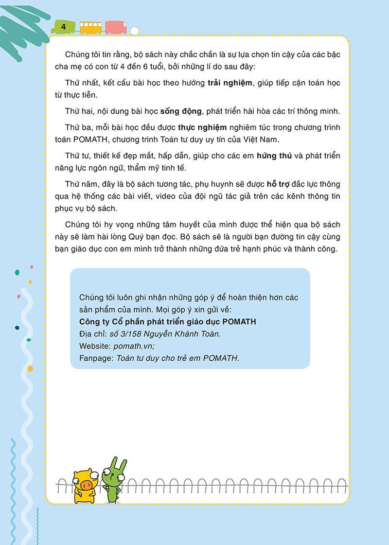 Với gần 20 năm nghiên cứu trong đó có hơn 6 năm triển khai chương trình POMATH, chúng tôi đã thực nghiệm thành công với hàng vạn học sinh theo học tại 7 trung tâm, hàng chục trường Mẫu giáo, Tiểu học trên địa bàn Hà Nội. Chúng tôi tin tưởng rằng bộ sách POMATH dành cho trẻ từ 4 – 6 tuổi sẽ là tài liệu bổ ích giúp các bé phát triển tư duy toán học trong giai đoạn vàng này. Các bậc phụ huynh hãy nhanh tay sở hữu ngay bộ sách POMATH để kích thích niềm đam mê toán học của con trẻ đúng phương pháp.