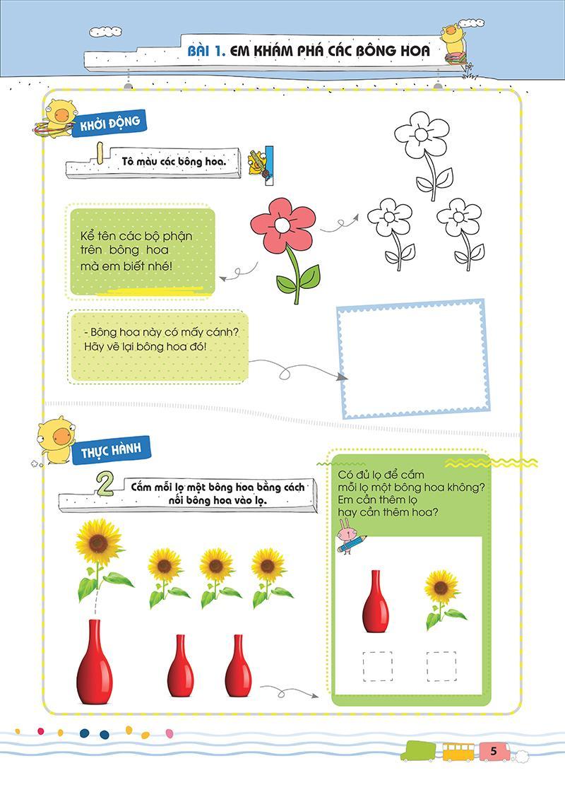 Tập 1 gồm 20 bài học, mỗi bài học được thiết kế theo dạng trải nghiệm. Các bé sẽ được hòa mình vào những câu chuyện thú vị. Đó là những câu chuyện thực tế giúp bé tiếp cận toán học một cách tự nhiên. Ví dụ như ở bài 1 các em sẽ được khám phá những bông hoa mà các em thường bắt gặp trong đời sống, em được thực hành đếm, vẽ, tô màu,… Qua đó kiến thức toán học được em tiếp nạp tự nhiên, không nặng nề, không gò bó.