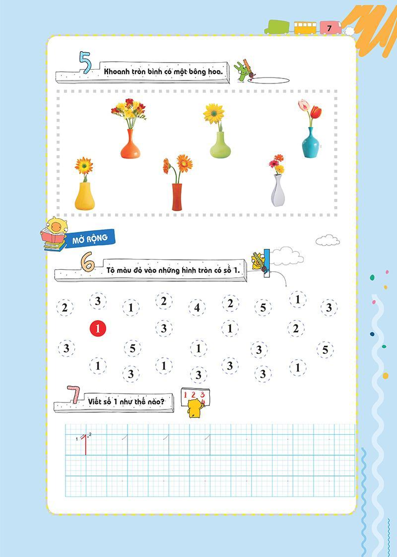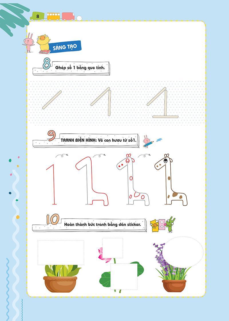 Với thiết kế bài học có nhiều hoạt động cần bé cầm bút để viết và vẽ sẽ là cơ hội tốt để các bé từ 4 – 6 tuổi, lứa tuổi cuối mầm non đầu tiểu học được làm quen với cách cầm bút. Với những nội dung cần bé viết số, cuốn sách đã thiết kế ô ly và viết mẫu ở đầu dòng giúp bé biết được đúng kích thước của chữ số và rèn luyện để viết số đúng chuẩn. Đây là một trong những nền tảng tốt để bé tự tin hơn khi bước vào tiểu học.