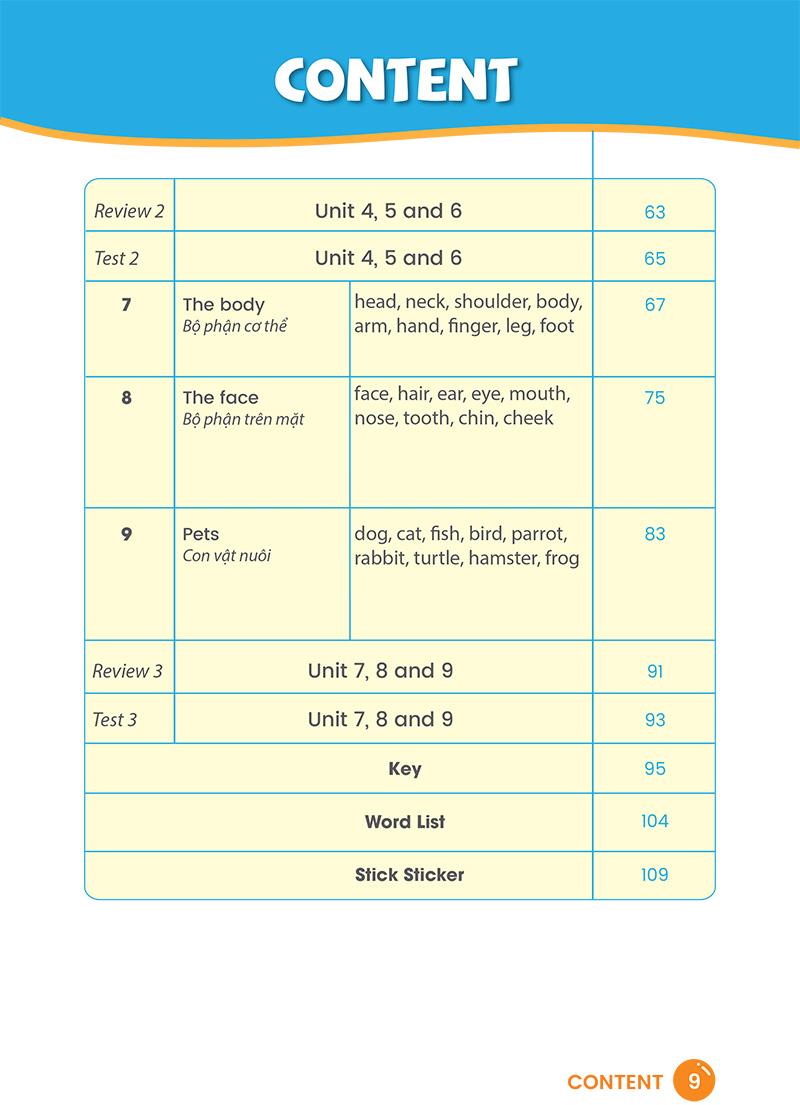 Mỗi cấp độ level sẽ có 9 bài (Unit) tương ứng với từng bài là các chủ đề khác nhau. Sau 3 bài lại có 1 bài ôn tập (Review) và 1 bài kiểm tra (Test).