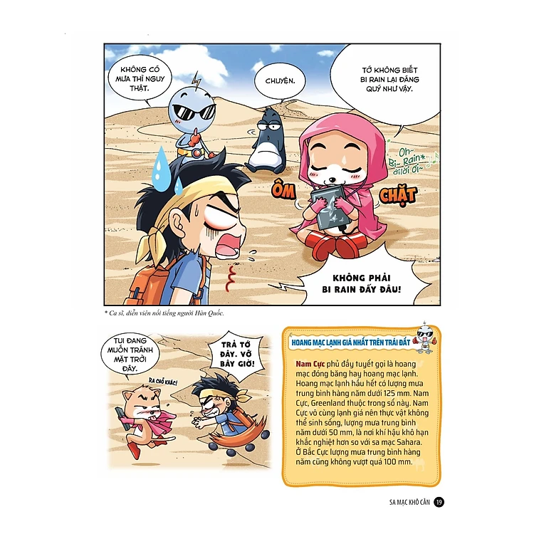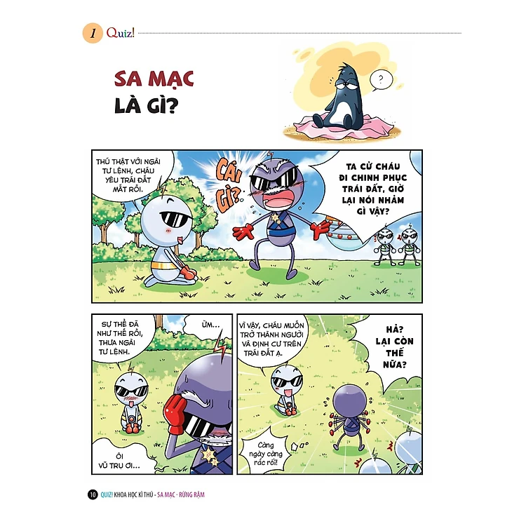 - "Quiz! Khoa Học Kì Thú: Sa Mạc Rừng Rậm" là cuốn sách thuộc bộ "Quiz! Khoa Học Kì Thú," cung cấp kiến thức khoa học dưới hình thức hỏi đáp thú vị. Cuốn sách tập trung vào các hiện tượng tự nhiên trong sa mạc và rừng rậm, như lý do đụn cát di chuyển trên sa mạc, hiện tượng "mưa bóng ma", hay thực vật ăn thịt trong rừng tiêu thụ loại côn trùng nào