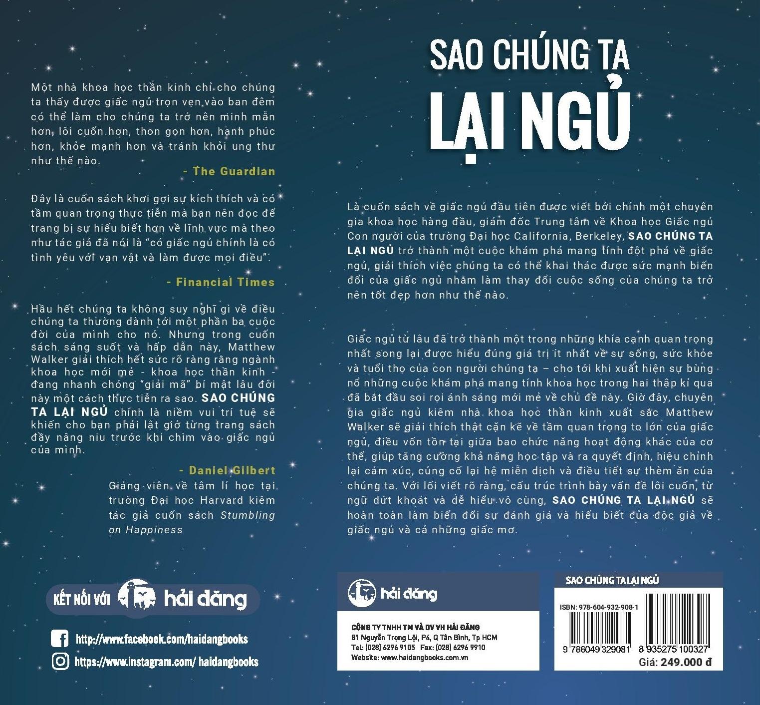Sách được giao rất nhanh, đóng gói sách kỹ, cẩn thận, siêu ưng ý. Sách rất đẹp đúng nghĩa xịn mịn, có bookmark, bìa bọc bên ngoài. Sách có bị in thừa một tý nhưng không sao. Là cuốn sách về giấc ngủ đầu tiên được viết bởi chính một chuyên gia khoa học hàng đầu, giám đốc Trung tâm về Khoa học Giấc ngủ Con người của trường Đại học California, Berkeley, Sao chúng ta lại ngủ trở thành một cuộc khám phá mang tính đột phá về giấc ngủ, giải thích việc chúng ta có thể khai thác được sức mạnh biến đổi của giấc ngủ nhằm làm thay đổi cuộc sống của chúng ta trở nên tốt đẹp hơn như thế nào. Giấc ngủ từ lâu đã trở thành một trong những khía cạnh quan trọng nhất song lại được hiểu đúng giá trị ít nhất về sự sống, sức khỏe và tuổi thọ của con người chúng ta – cho tới khi xuất hiện sự bùng nổ những cuộc khám phá mang tính khoa học trong hai thập kỉ qua đã bắt đầu soi rọi ánh sáng mới mẻ về chủ đề này.