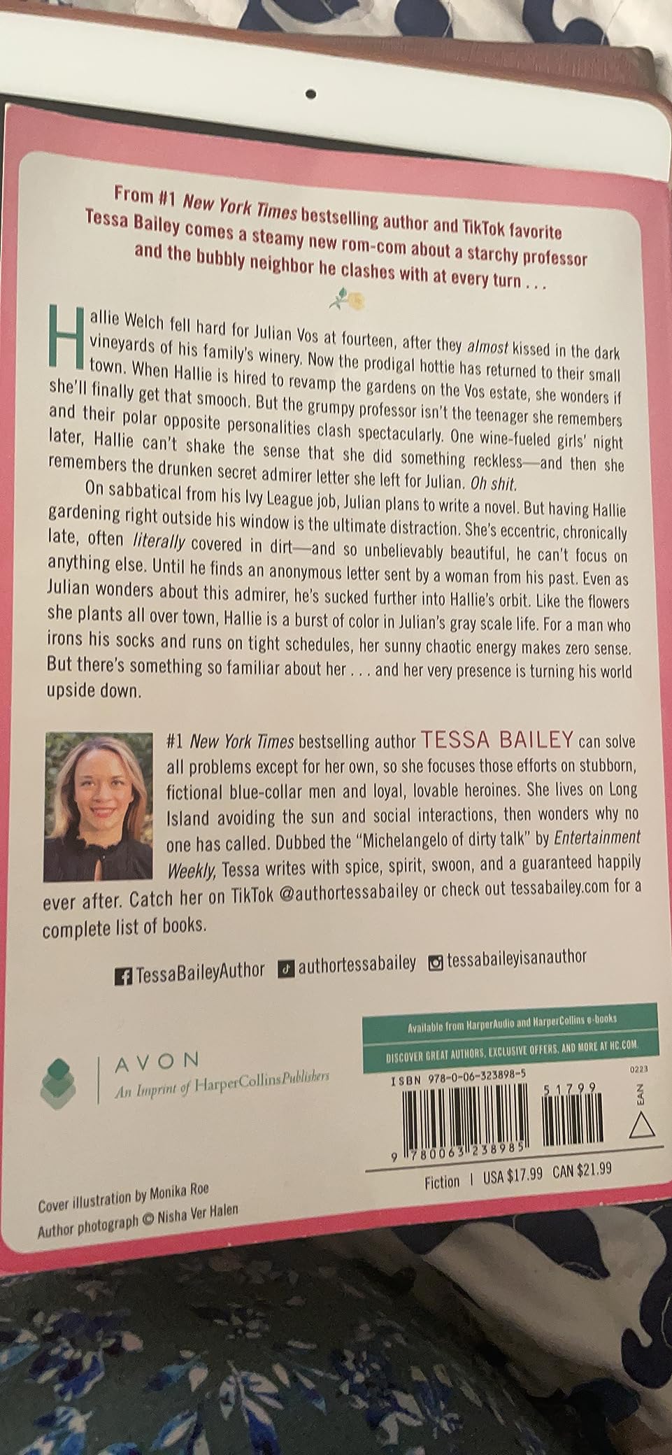 Even as Julian wonders about this admirer, he’s sucked further into Hallie’s orbit. Like the flowers she plants all over town, Hallie is a burst of color in Julian’s grayscale life. For a man who irons his socks and runs on tight schedules, her sunny chaotic energy makes zero sense. But there’s something so familiar about her... and her very presence is turning his world upside down.