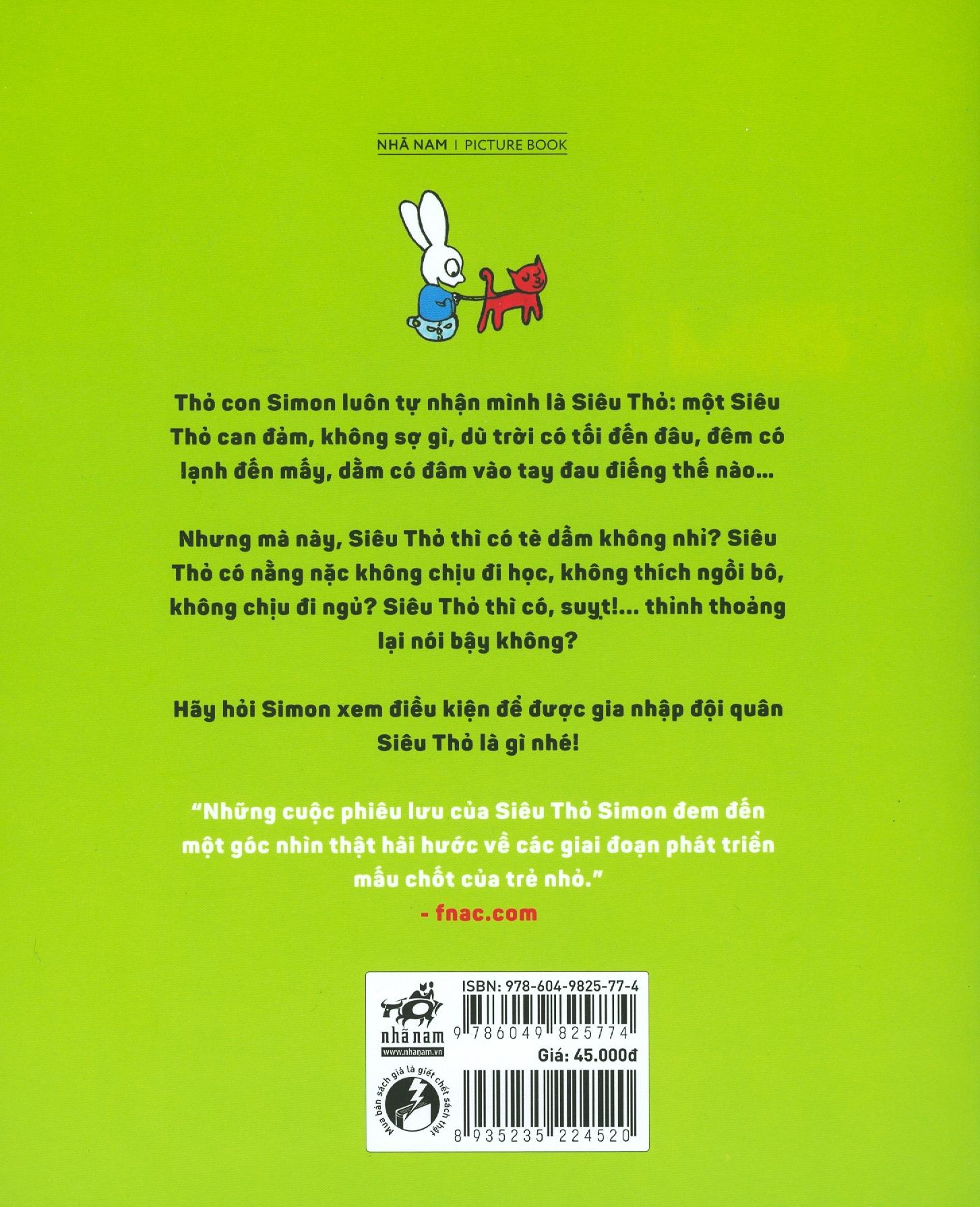 Thỏ con Simon luôn tự nhận mình là Siêu Thỏ: một Siêu Thỏ can đảm, không sợ gì, dù trời có tối đến đâu, đêm có lạnh đến mấy, dằm có đâm vào tay đau điếng thế nàNhưng mà này, Siêu Thỏ thì có tè dầm không nhỉ? Siêu Thỏ có nằng nặc không chịu đi học, không thích ngồi bô, không chịu đi ngủ? Siêu Thỏ thì có, suỵt!ỉnh thoảng lại nói bậy nữa không?