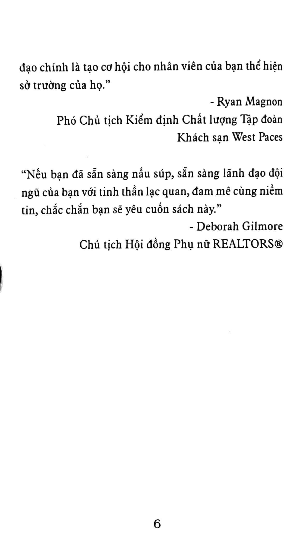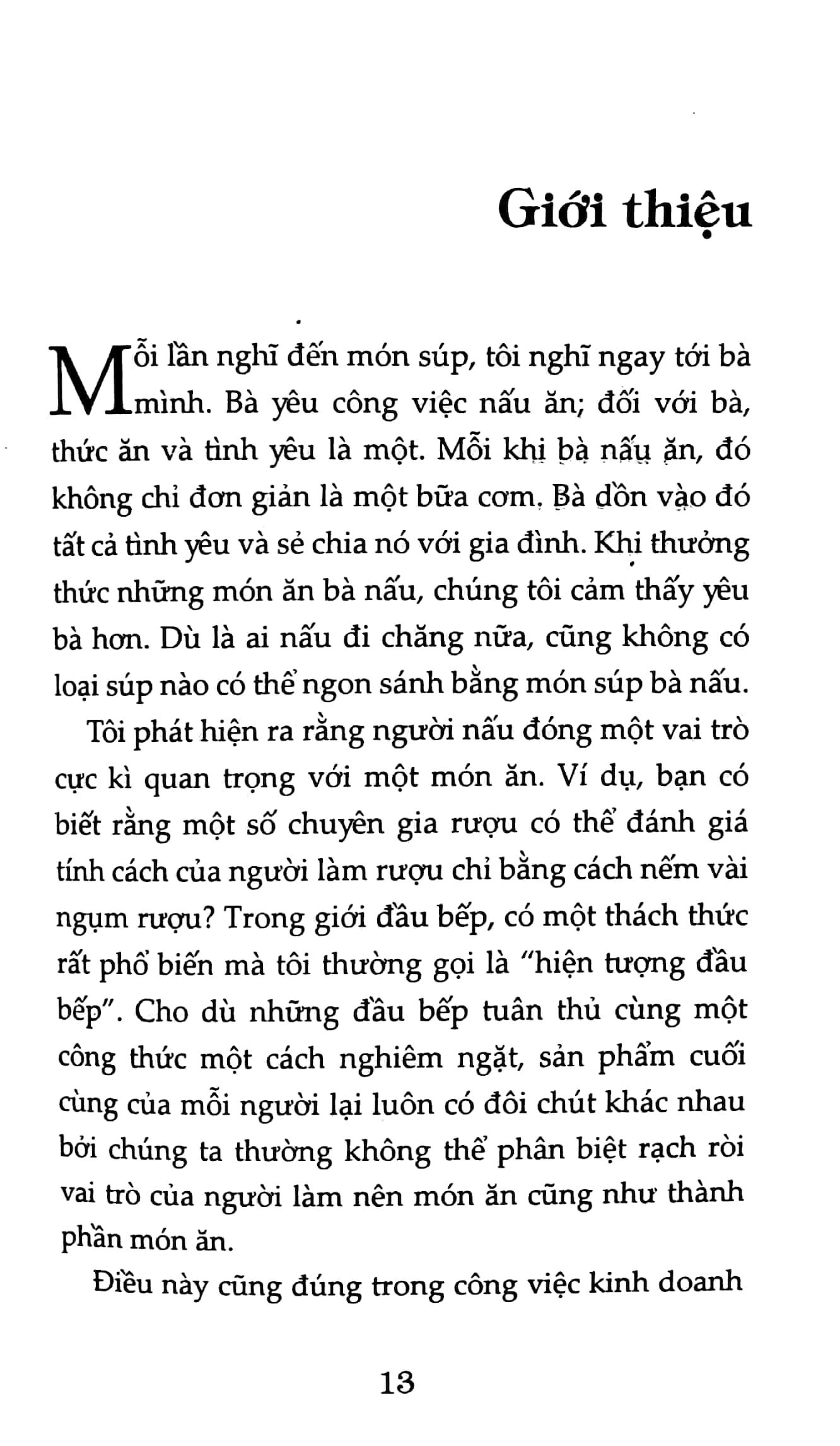 Giống như khi nấu súp, hương vị của món ăn sẽ cho thấy giá trị của người nấu súp. Mặc dù công thức làm nên món ăn ngon, nhưng cũng có rất nhiều công thức nấu ăn ngon ở ngoài kia. Bí quyết chính là ta - người nấu mới đóng vai trò quan trọng. Trong một tập thể cũng vậy, người lãnh đạo chính là người đặt nền tảng cho văn hóa của tập thể ấy. Cuốn sách này sẽ nêm thêm gia vị vào cuộc sống của bạn, vào cuộc sống của nhiều người khác và đội ngũ của bạn...