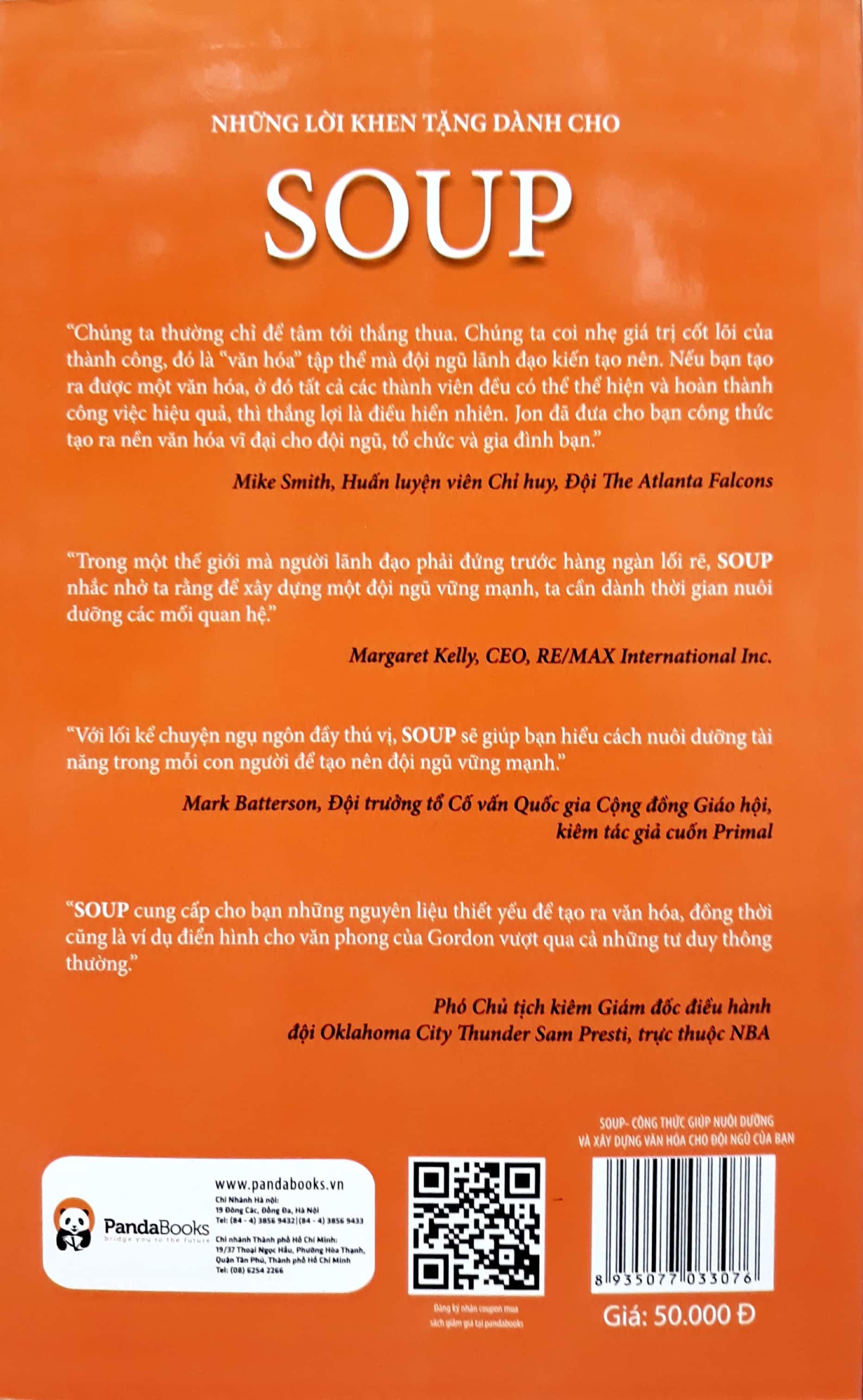Soup là một công thức thành công dành cho tất cả mọi người dù ở bất kỳ vị trí nào. Soup truyền tải một thông điệp có sức lan tỏa mạnh mẽ. Chất lượng sự nghiệp, công việc kinh doanh hay đội ngũ của bạn quản lí được quyết định bởi chất lượng những mối quan hệ quanh bạn.