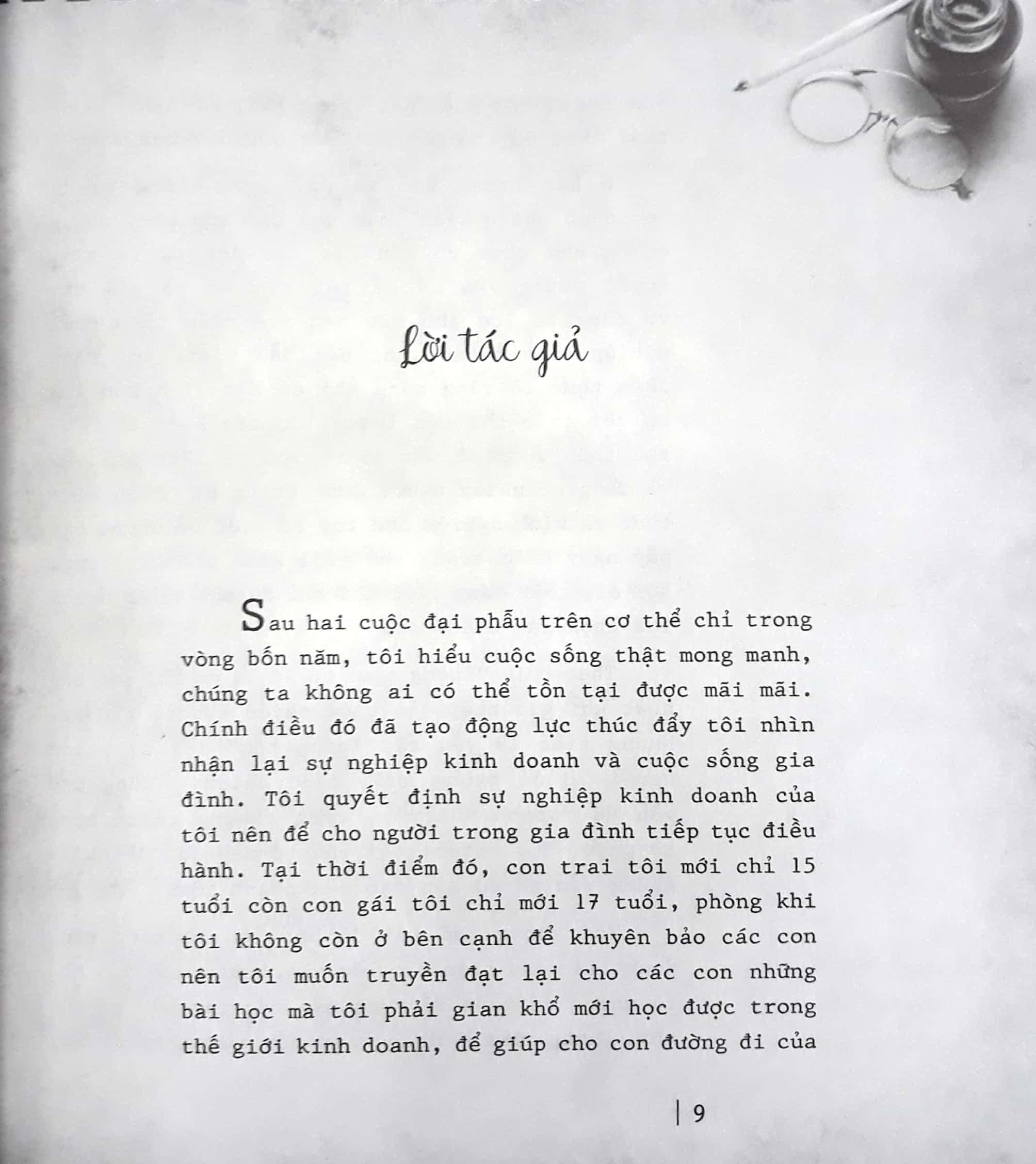 Tôi tin rằng làm cha mẹ ai cũng mong muốn con cái mình giỏi giang, thành đạt và hạnh phúc. Doanh nhân – những người thực sự lao động rất vất vả và rất ít thời gian cho con cái – không chỉ lo cho các con mà còn phải lo lắng cho sự nghiệp, cho doanh nghiệp, cho đời sống nhân viên của mình. Chúng tôi vừa phải nuôi dạy bọn trẻ, vừa phải “nuôi dạy” doanh nghiệp do mình tạo dựng nên.