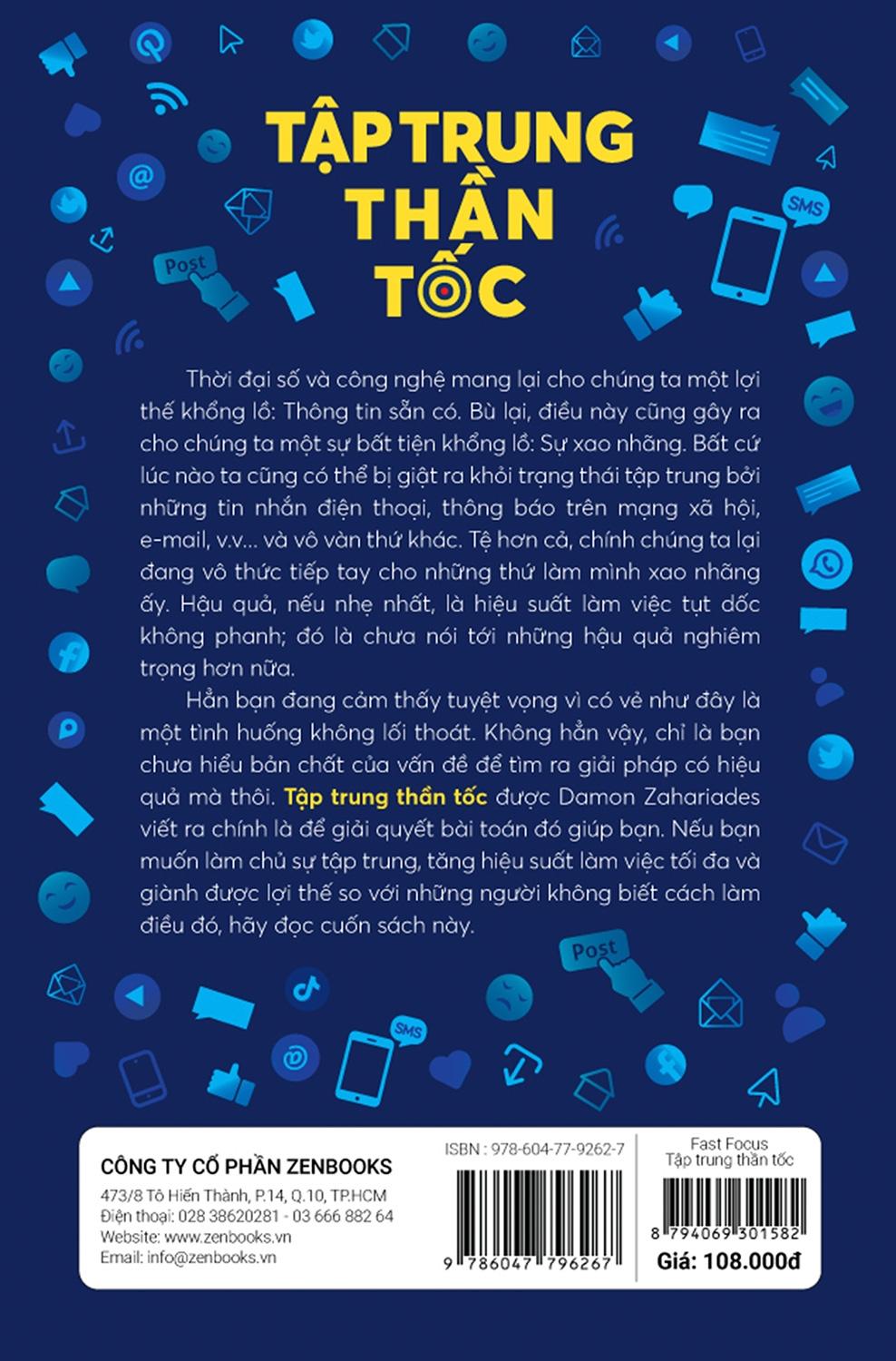 Thời đại số và công nghệ mang lại cho chúng ta một lợi thế khổng lồ: Thông tin sẵn có. Bù lại, điều này cũng gây ra cho chúng ta một sự bất tiện khổng lồ: Sự xao nhãng. Bất cứ lúc nào ta cũng có thể bị giật ra khỏi trạng thái tập trung bởi những tin nhắn điện thoại, thông báo trên mạng xã hội, e-mail, và vô vàn thứ khác. Tệ hơn cả, chính chúng ta lại đang vô thức tiếp tay cho những thứ làm mình xao nhãng ấy. Hậu quả, nếu nhẹ nhất, là hiệu suất làm việc tụt dốc không phanh; đó là chưa nói tới những hậu quả nghiêm trọng hơn nữa.Giá sản phẩm trên Tiki đã bao gồm thuế theo luật hiện hành. Bên cạnh đó, tuỳ vào loại sản phẩm, hình thức và địa chỉ giao hàng mà có thể phát sinh thêm chi phí khác như phí vận chuyển, phụ phí hàng cồng kềnh, thuế nhập khẩu (đối với đơn hàng giao từ nước ngoài có giá trị trên 1 triệu đồng).....