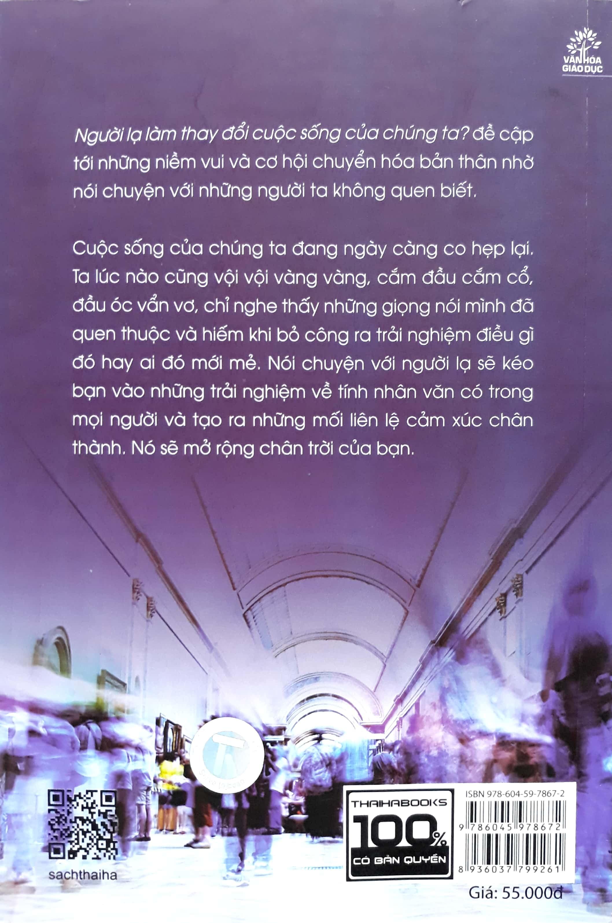Đây là cuốn sách về trò chuyện, và nó cũng là cuốn sách về cách nhìn nhận, lắng nghe và nhắc nhở về thế giới. Có những mối liên hệ chỉ trong giây lát lại có thể nên thơ và sâu sắc như thế nào để bạn mở rộng tầm hiểu biết của mình và làm phong phú thêm những khái niệm về con người – những người lạ với bạn. Và cuốn sách cũng cho thấy động cơ ẩn chứa và ý nghĩa của những tương tác trên phố. Bạn sẽ tìm thấy một cách mới để yêu thêm thế giới này.