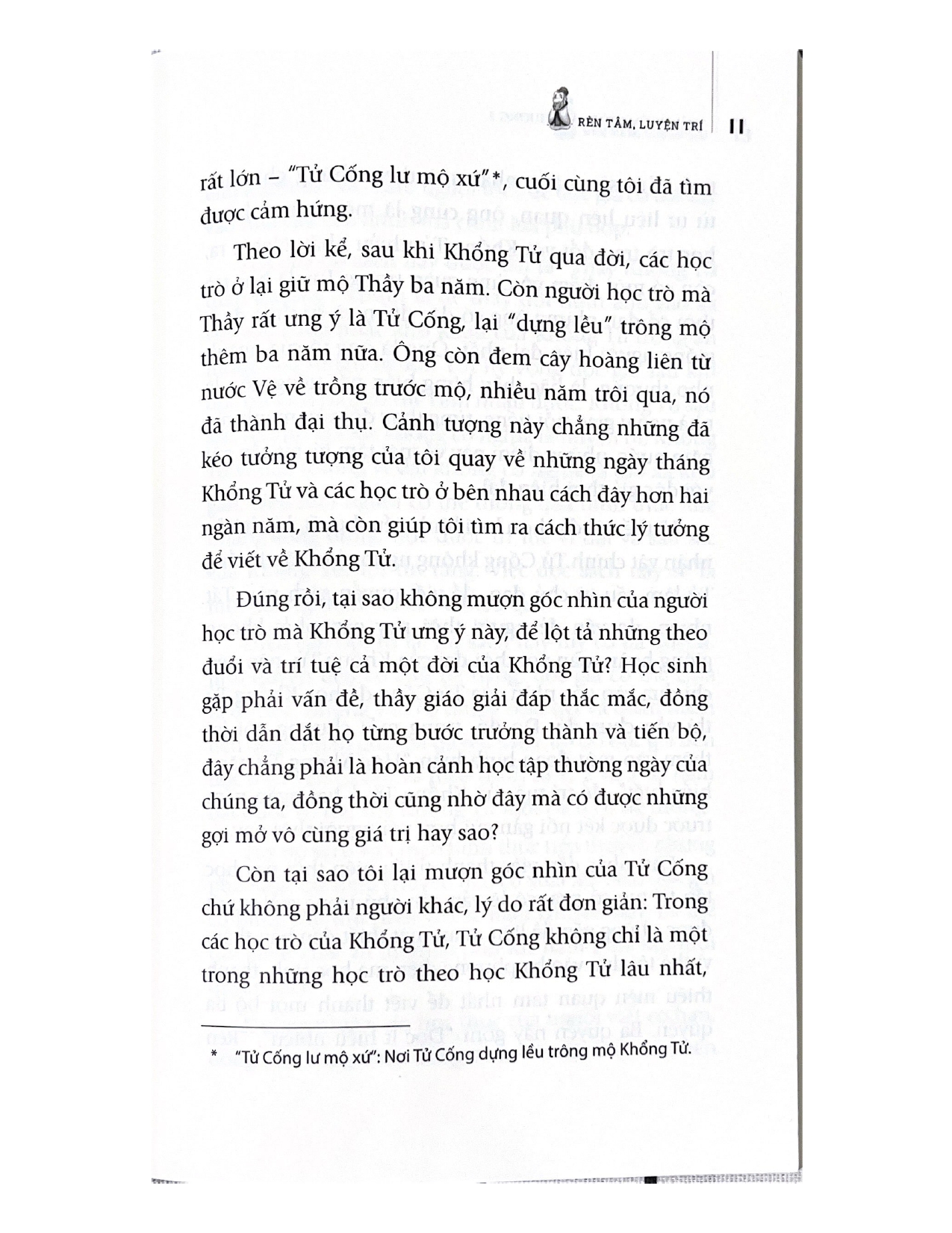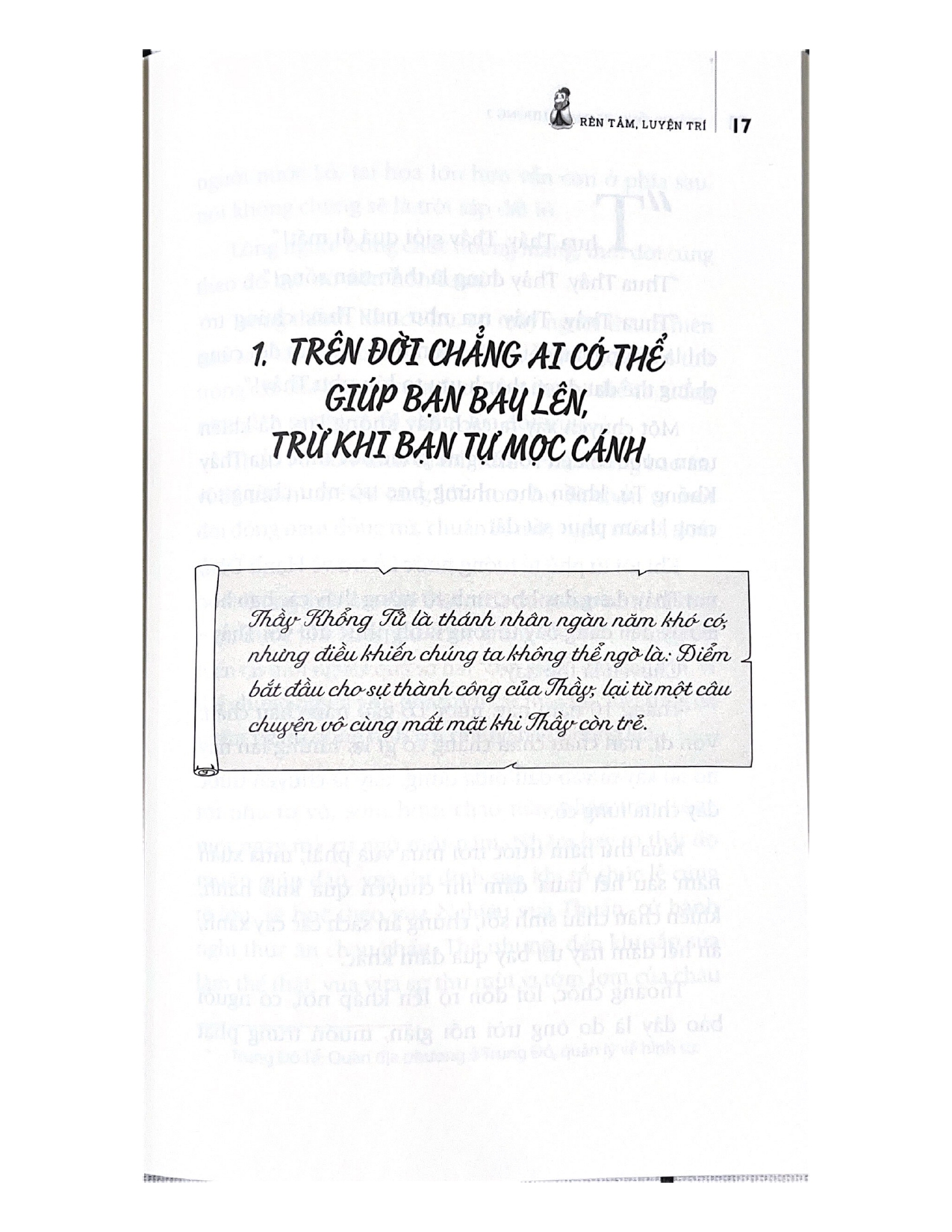 Khổng Tử thời trẻ vì bị sỉ nhục mà phấn đấu thay đổi bản thân. Trong thời gian chu du các nước, Thầy phải trải qua biết bao gian khó nhưng vẫn không từ bỏ lý tưởng ban đầu theo đuổi. Tử Lộ phải chăng do không thách thức triệt để khuyết điểm của bản thân mà gặp phải họa sát thân? Tử Cống đã khiêm tốn học hỏi người khác thế nào mà trở thành người có tài ăn nói giỏi nhất?... Tất cả đều là bí quyết giúp các bạn trẻ rèn luyện tâm trí mạnh mẽ, sở hữu tâm thái tích cực, và gặt hái được nhiều thành công.